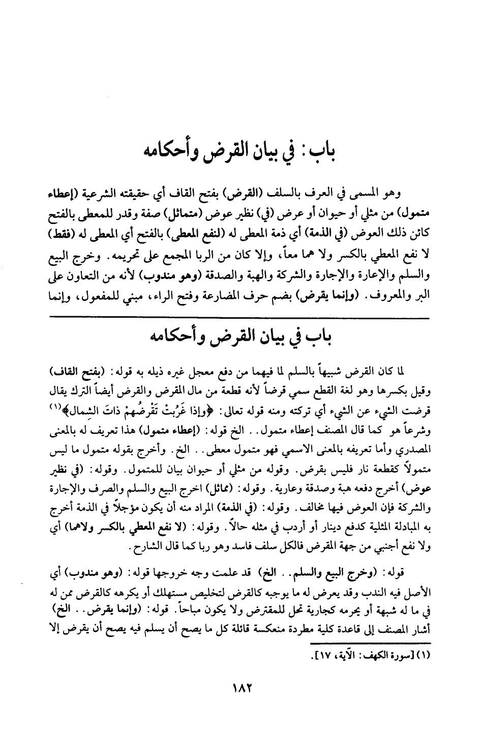 قوله : 16 ( بفتح القاف ) : وقيل بكسرها وهو لغة القطع . سمي قرضاً : لأنه قطعة من مال المقرض . والقرض أيضاً : الترك ، يقال : قرضت الشيء عن الشيء أي تركته ومنه قوله تعالى : { وَإذَا غَرَبتْ تَقْرِضْهُمْ ذَاتَ الشِّمالِ } وشرعاً : هو كما قال المصنف : إعطاء متمول إلخ .