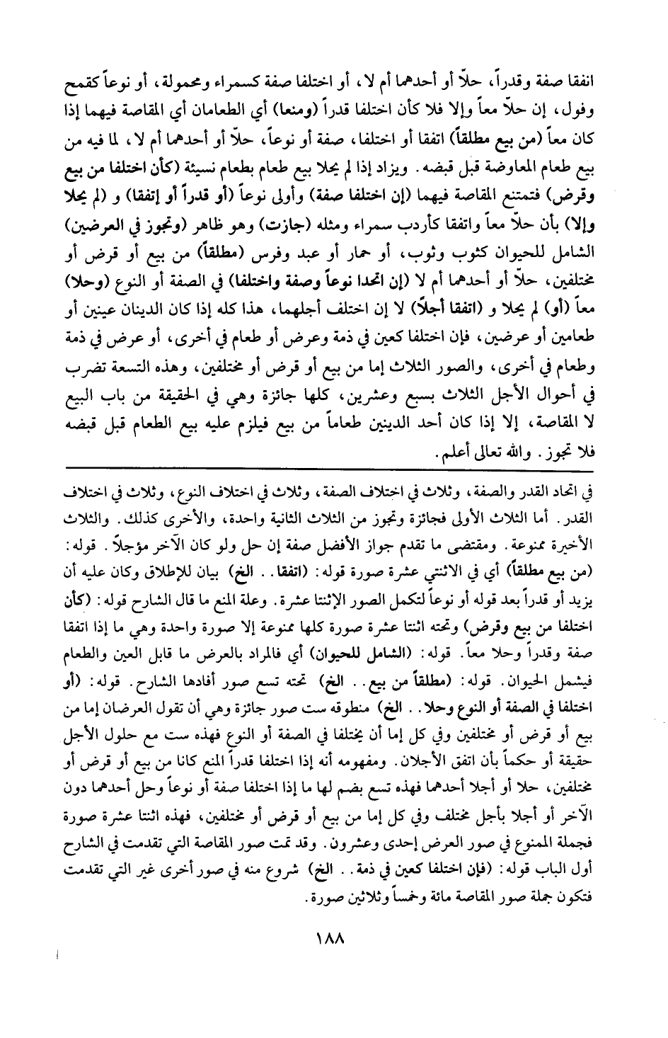 قوله : 16 ( او اختلفا في الصفة أو النوع وحلا ) إلخ : منطوقه ست صور جائزة وهي أن تقول : العرضان ، إما من بيع أو قرض أو مختلفين ، وفي كل : إما أن يختلفا في الصفة أو النوع ؛ فهذه ست مع حلول الأجل حقيقة أو حكماً بأن اتفق الأجلان ، ومفهومه أنه إذا اختلفا قدراً المنع كانا من بيع أو قرض أو مختلفين حلا أو أجّلا أو حل أحدهما ، فهذه تسع ، يضم لها ما إذا اختلفا صفة أو نوعاً وحل أحدهما دون الآخر أو أجلا بأجل مختلف ، وفي كل : إما من بيع أو قرض أو مختلفين ، فهذه ثنتا عشرة صورة فجملة الممنوع في صور العرض أحدى وعشرون . وقد تمت صور المقاصة التي تقدمت في الشارح أو الباب .