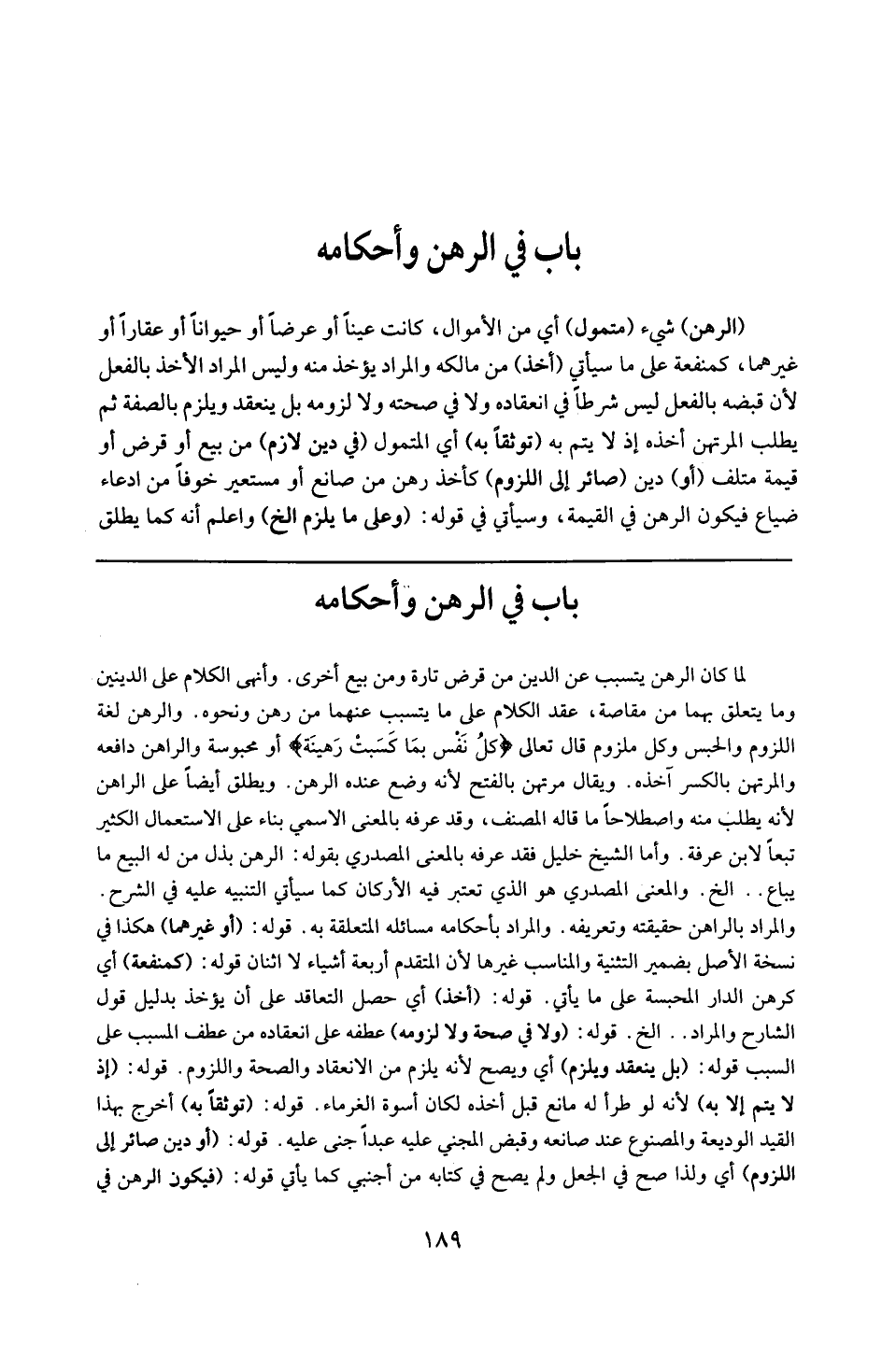 لما كان الرهن يتسبب عن الدين من قرض تارة ومن بيع أخرى ، وانهى الكلام على الدينيم وما تيعلق بهما من مقاصة عقد الكلام على ما يتسبب عنهما من رهن ونحوه ، والرهن لغة : اللزوم والحبس وكل ملزم ، قال تعالى : { كُلُّ نَفْسٍ بِمَا كَسَبَتْ رَهِينَةً } : أي محبوسة . والرهن : دافعة والمرتهن بالكسر : آخذه . ويقال مرتهن بالفتح لأنه وضع عنده الرهن . ويطلق أيضاً على الراهن لأنه يطلب منه ؛ واصطلاحاً ما قاله المصنف ، وقد عرفه بالمعنى الأسمى بناء على الاستعمال الكثير تبعا ل ابن عرفة ، وأما الشيخ خليل فقد عرفه بالمعنى المصدري بقوله : الرهن بذل من له البيع ما يباع إلخ . والمعنى المصدري هو الذي تعتبر فيه الأركان كما سيأتي التنبيه عليه في الشرح . والمراد بالرهن : حقيقته وتعريفه ، والمراد بأحكامه : مسائله المتعلقة به .