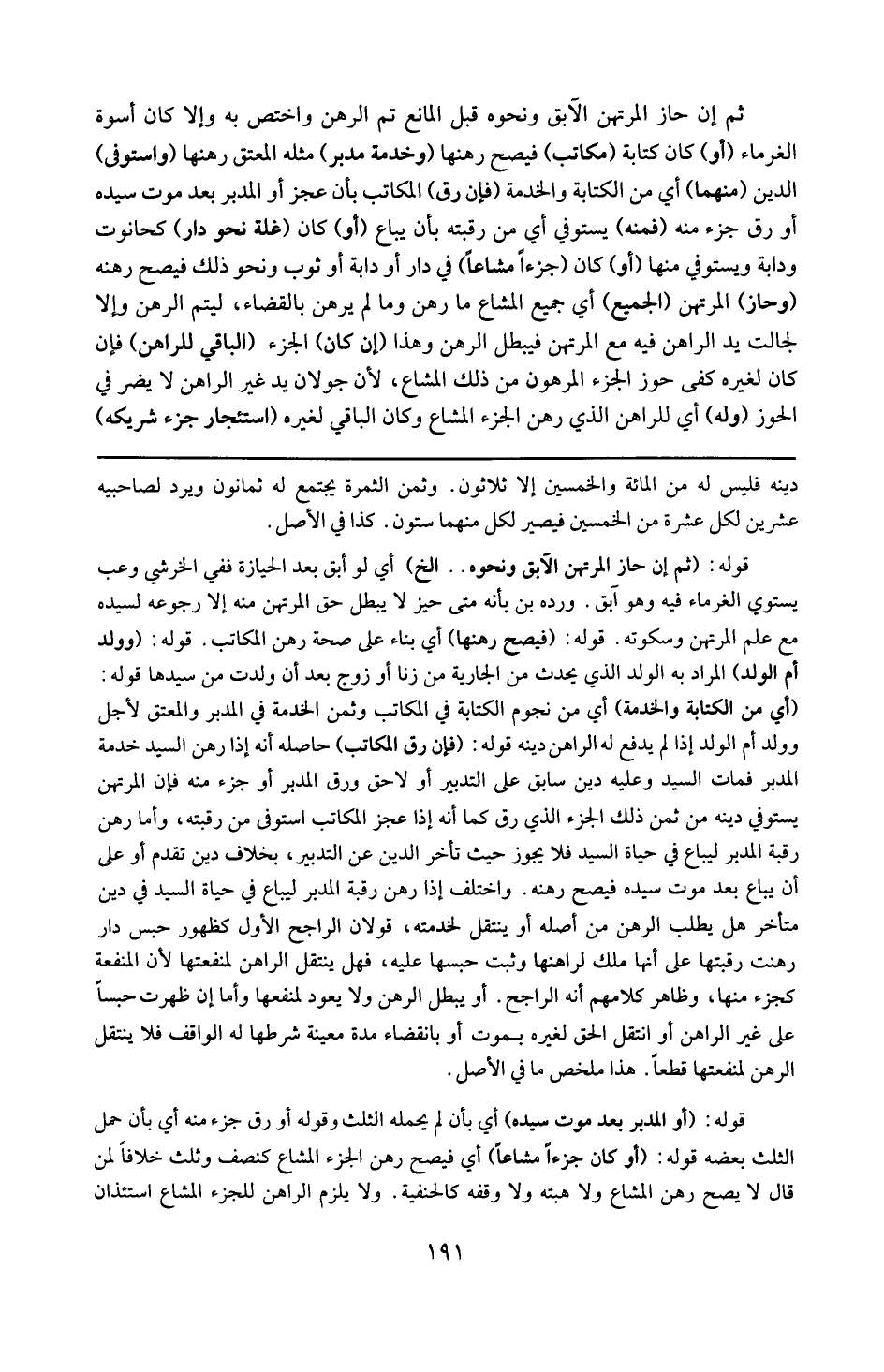 قوله : 16 ( فإن رق المكاتب ) : حاصله أنه إذا رهن السيد خدمة المدبر فمات السيد وعليه دين سابق على التدبير أو لاحق ورق المدبر أو جزء منه ، فإن المرتهن يستوفي دينه من ثمن ذلك الجزء الذي رق ، كما أنه إذا عجز المكاتب استوفى من رقبته . واما رهن رقبة المدبر ليباع في حياة السيد فلا يجوز حيث تأخر الدين عن التدبير ، بخلاف دين تقدم أو على أن يباع بعد موت سيده فيصح رهنه . واختلف إذا رهن رقبة المدبر لبياع في حياة السيد .