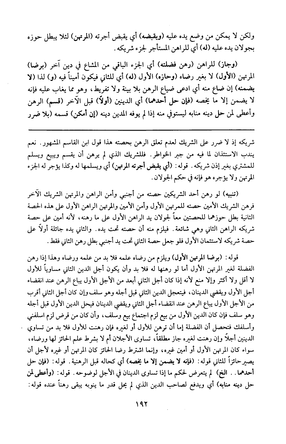 تنبيه : لور هن أحد الشريكين حصته من أجنبي وأمن الراهن والمرتهن الشريك الآخر فرهن الشريك الأمين حصته للمرتهن الأول وامن الأمين والمرتهن الراهن الأول على هذه الحصة الثانية ، بطل حوزهما للحصتين معاً لجولان يد الراهن الاول على ما رهنه ، لانه أمين على حصة شريكه الراهن الثاني وهي شائعة ، فيلزم منه أن حصته تحت يده والثاني يده جائلة اولا على حصة شريكه لاستئمان الاول ، فلو جعل حصة الثاني تحت يد أجنبي بطل رهن الثاني فقط .