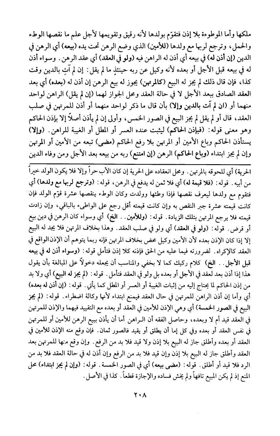 قوله : 6 ( وترجع لربها مع ولدها ) : أي فتقوم مع ولدها ليعرف نقصها ، فإذا وطئها وولدت وكان الوطء ينقصها عشرة قوم الولد فإن كانت قيمته عشرة جبر النقص به ، وإن كانت قيمته أقل رجع على الواطئ بالباقي ، وإن زادت قيمته فلا يرجع المرتهن بتلك الزيادة .