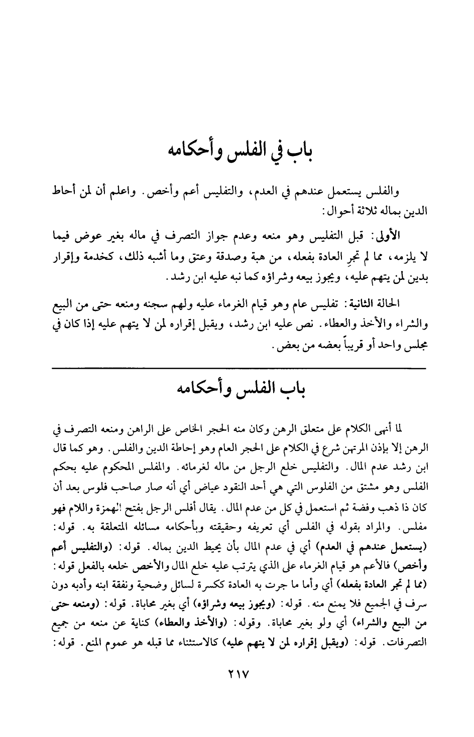 لما أنهي الكلام على متعلق الرهن وكان منه الحجر الخاص على الراهن ومنعه التصرف في الرهن إلا بإذن المرتهن شرع في الكلام على الحجر العام : وهو إحاطة الدين والفلس . وهو كما ابن رشد عدم المال ، والتفليس : خلع الرجل من ماله لغرمائه . والمفلس : المحكوم عليه بحكم الفلس ، وهو مشتق من الفلوس التي أحد النقود عياض : أي أنه صار صاحب فلوس بعد أن كان ذا ذهب وفضة ثم استعمل في كل من عدم المال . يقال : أفلس الرجل بفتح الهمزة واللم فهو مفلس .