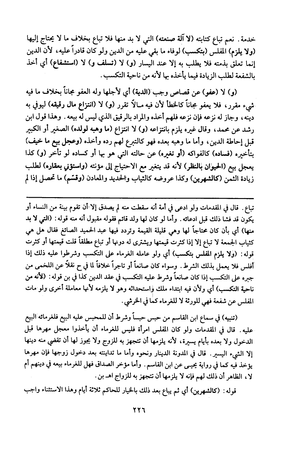 قوله : 16 ( التي لابد منها ) : أي بأن كان محتاجاً لها وهي قليلة القيمة ، وتردد فيها عبد الحميد الصائغ فقال : هل هي كثياب الجمعة لا تباع إلا إذا كثرت قيمتها ويشتري له دونها ، أو تباع مطلقاً قلّت قيمتها او كثرت .
