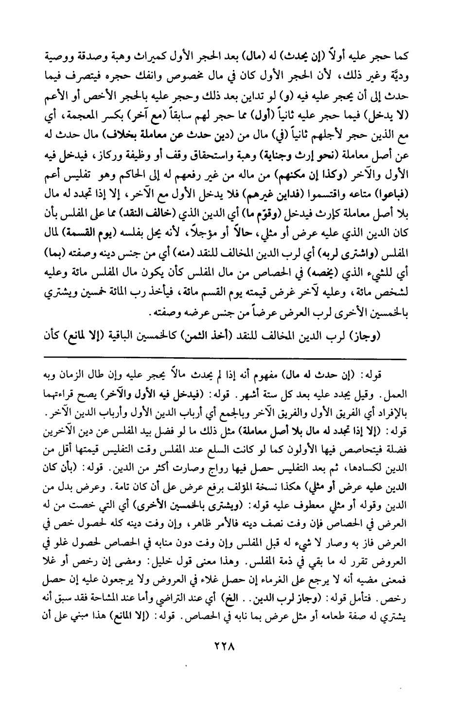 قوله : 16 ( ويشتري بالخمسين الأخرى ) : أي التي خصت من له العرض في الحصاص ، فإن وفت نصِّف دينه فالامر ظاهر ، وإن وفت دينه كله لحصول رخص في العرض فاز به وصار لا شيء له قبل المفلس ، وإن وفت دون منابه في الحصاص غلّو فيالعروض تقرر له ما بقي في ذمة المفلس . وهذا معنى قول خليل : ومضى إن رخص أو غلا ، فمعنى مضيه : انه لايرجع على الغرماء إن حصل غلاء في العروض ولا يرجعون عليه إن حصل رخص فتأمل .