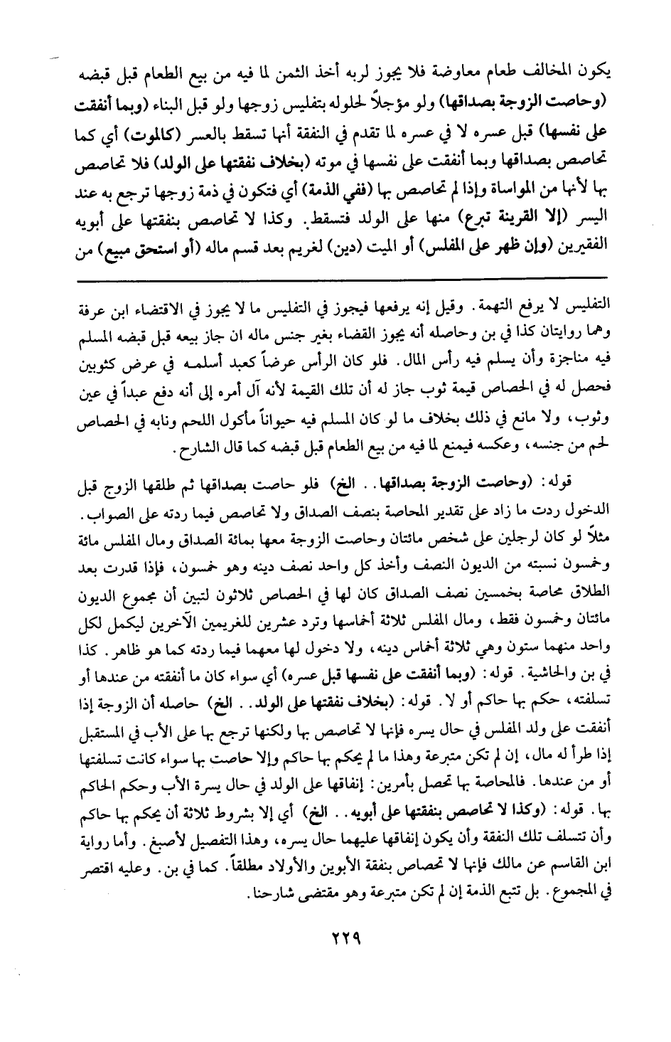قوله : 16 ( بخلاف نفقتها على الوالد ) إلخ : حاصله ان الزوجة إذا أنفقت على ولد المفلس في حال يسره ، فإنها لا تحاصص بها . ولكنها ترجع على الأب في المستقبل إذا طرأ له مال إن لم تكن متبرعة وهذا ما لم يحكم بها حاكم ، وإلا حاصت بها سواء كانت تسلفتها او من عندها . فالمحاصة بها تحصل بأمرين : اتفاقها على الولد في حال يسرة الأب ، وحكم الحاكم بها .