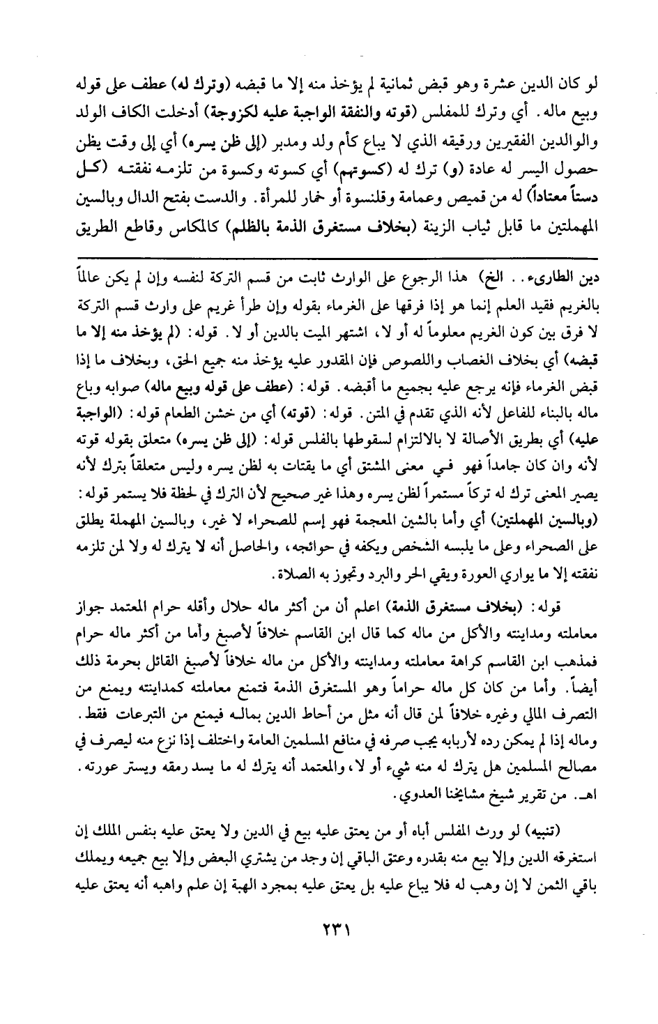قوله : 6 ( بخلاف مستغرق الذمة ) : اعلم ان من أكثر ماله حلال وأقله حرام : المعتمد جواز معاملته ومداينته والاكل من ماله كما قال ابن القاسم خلافاً ل أصبغ . وأما من كثر ماله حرام فمذهب ابن القاسم كراهة معاملته ومدانته والاكل من ماله ، خلافاً لأصبغ القائل بحرمة ذلك أيضاً . واما من كان كل ماله حرام وهو المستغرق الذمة فتمنع معاملته ومداينته ويمنع من التصرف المالي وغيره ، خلافاص لمن قال إنه مثل من أحاط بماله فيمنع من التبرعات فقط . وماله إذا لم يمكن رده لأربابه يجب صرفه في منافع المسلمين العامة . واختلف إذا نزع منه ليصرف في مصالح المسلمين ، هل يترك له منه شيء أولا ؟ والمعتمد أنه يترك له ما يسد رمقه ويستر عورته ( اه . من تقرير شيخ مشايخنا . العدوي )