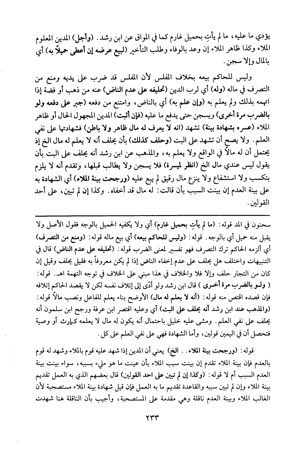 قوله : 16 ( والمذهب عند ابن رشد أنه يحلف على البت ) : أي وعليه اقتصر ابن عرفة ورجح ابن سلمون أنه يحلف على نفي العلم ومشى عليه خليل باحتمال أنه يكون له مال لا يعلمه بكإرث او وصية فتحصل ان في اليمين قولين وأما الشهادة فهي على نفي العلم على كل .