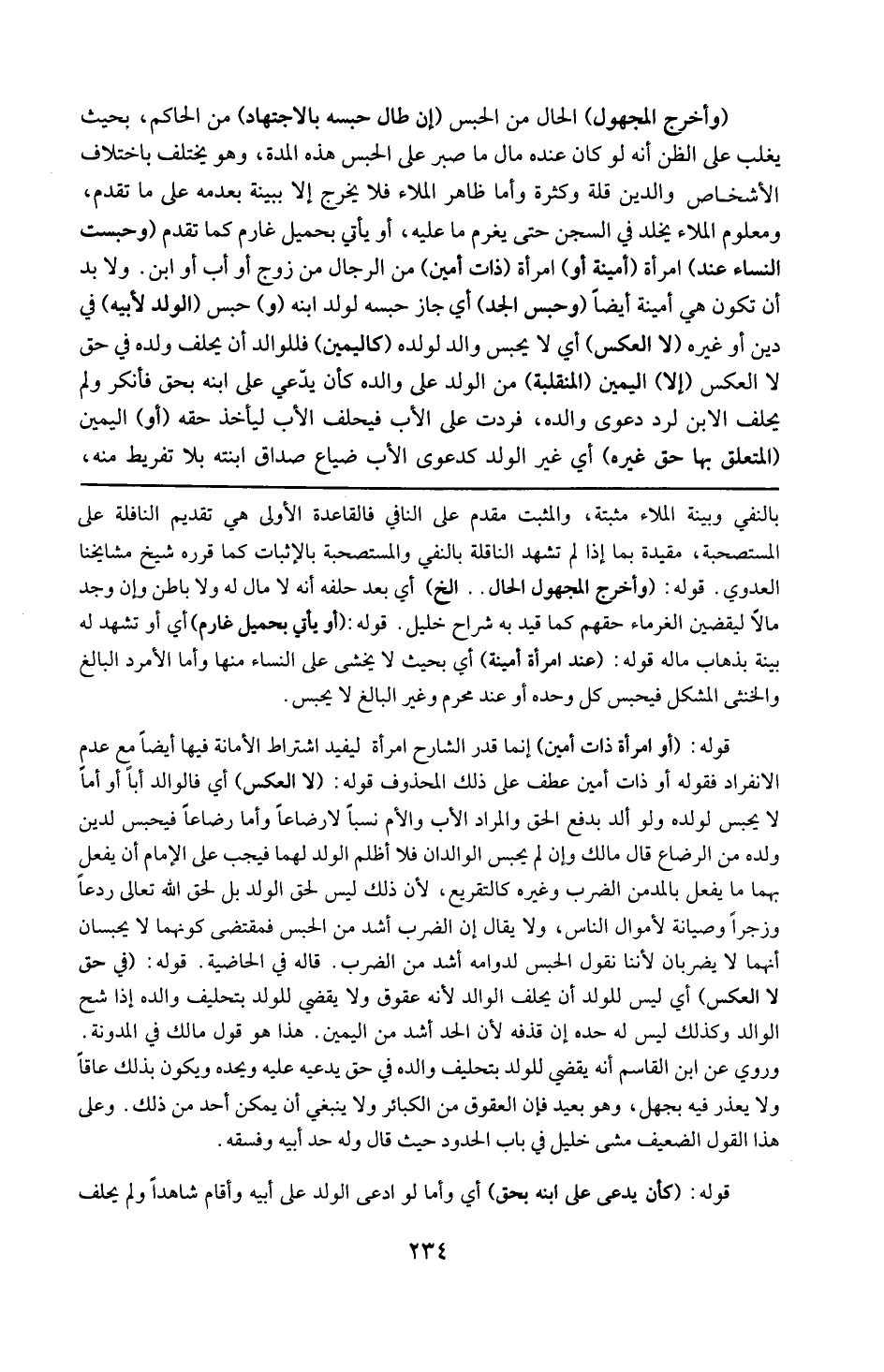 قوله : 16 ( لا العكس ) : أي فالوالد أباً أو أمّاً لا يحبس لولده ولو ألد بدفع الحق والمراد الأب والأم نسباً لارضاعاص وأما رضاعاً فيحبس لدين ولده من الضاع . قال مالك وإن لم يحبس الوالدان فلا أظلم الولد لهما ، فيجب على الإمام أن يفعل بهما ما يفعل بالمُلدّ من الضرب وغيره كالتقريع ، لان ذلك ليس الولد بل لحق لله تعالى ردعاً وزجراً وصيانة لاموال الناس . ولا يقال : إن الضرب أشد من الحبس فمقتضى كونهما لايحبسان أنهما لايضربان ، لأننا نقول : الحبس لدوامه أشد من الضرب قاله في الحاشية .