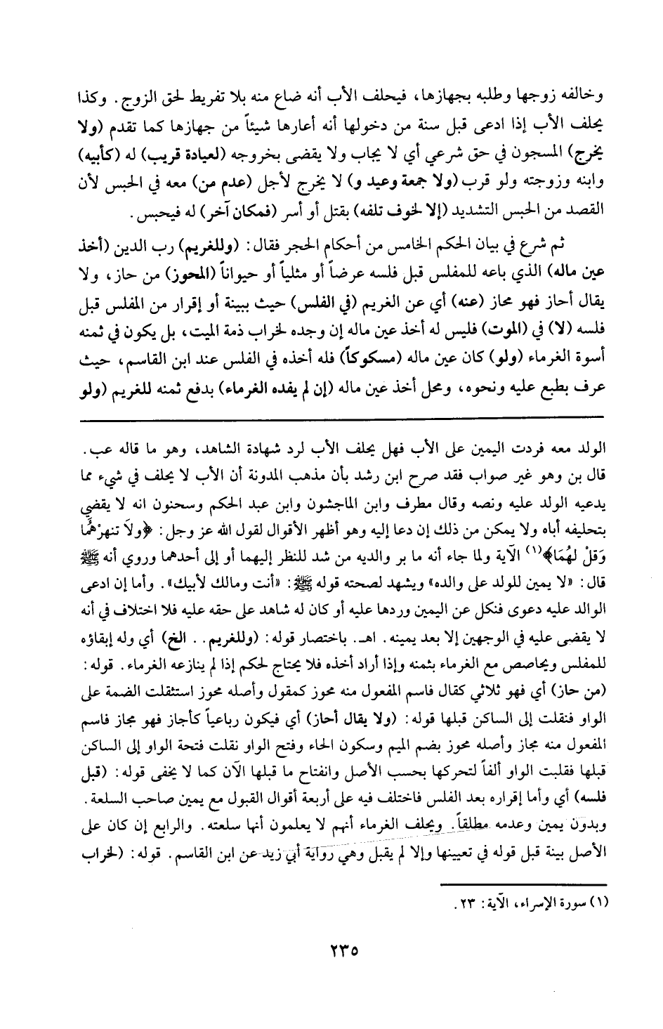 الولد معه فردت اليمين على الأب ؛ فهل يحلف الأب لرد شهادة الشاهد ؟ وهو ما قاله ( عب ) قال ( بن ) وهو غير صواب ، فقد صرح ابن رشد بان مذهب المدونة أن الأب لا يحلف في شيء مما يدعيه الولد ونصه : وقال مطرف و ابن الماجشون و ابن عبد الحكم و سحنون إنه لا يقضي يتحليفه أباه ولا يمكن من ذلك إن دعا إليه وهو أظهر الأقوال لقول لله عز وجل { وَلاتَنْهَرُهُمَا وَقُلْ لَهما } الآية ، ولما جاء أنه : ( ما بَرَّ والديه من شد النظر إليهما أو إلى أحدهما ) وروي أنه قال : ( لايمين للولد على والده ) ويشهد لصحته قوله : ( أنت ومالك لأبيك ) . وأما إن ادعى الوالد عليه دجعوى فنكل عن اليمين وردها عليه أو : كان له شاهد على حقه عليه فلا اختلاف في انه لا يقضي له عليه في الوجهين إلا بعد يمينه ( اه . ) باختصار .