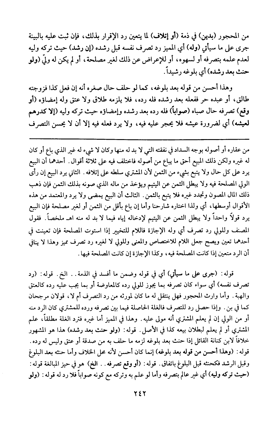 قوله : 16 ( رد تصرف نفسه ) : أي سواء كان تصرفه بما يجوز للولي رده كالمعاوضة أو بما يجب عليه رده كالعتق والهبة وأما وارث المحجور ، فهل ينتقل له ما كان لمورثه من رد التصرف أم لا ؟ قولان مرجحان كما في ( بن ) . وإذا حصل رد للتصرف فالغلة الحاصلة فيما بين تصرفه ورده للمشتري كان الرد منه أو من الولي إن لم يعلم المشتري أنه مولى عليه وهذا في المميز . وأما غيره فترد الغلة مطلقاً على المشتري أو لم يعلم لبطلان بيعه كذا في الأصل .