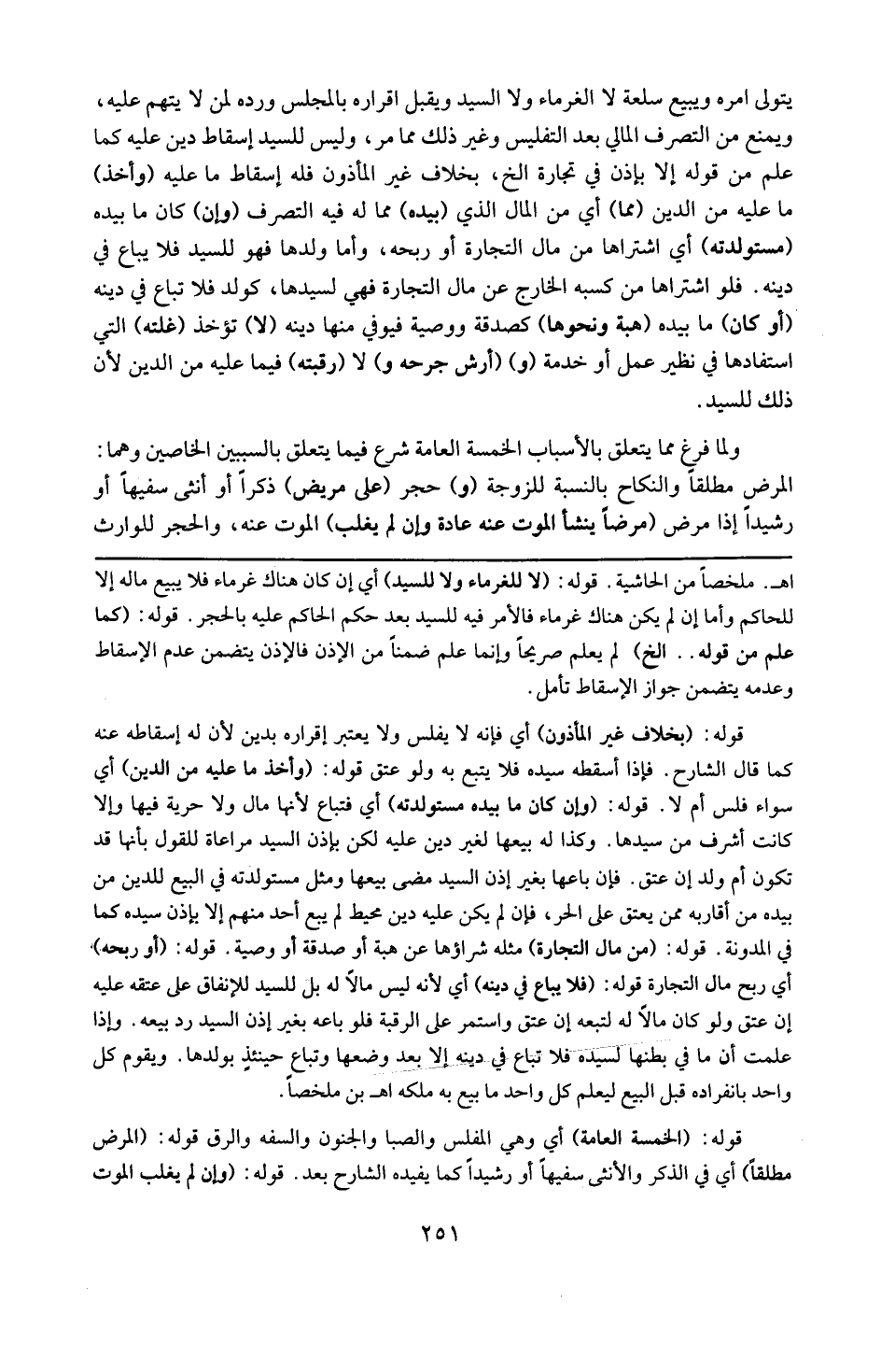 قوله : 16 ( لا الغرماء ولا السيد ) : أي إن كان هناك غرماء فلا يبيع ماله إلا لحاكم . وأما إن لم يكن هناك غرماء فالأمر فيه للسيد بعد حكم الحاكم عليه بالحجر .