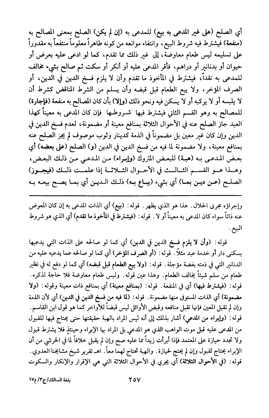 قوله : 16 ( وألا يلزم فسخ الدين في الدين ) : أي كما لو صالحه على الذات التي يدعيها بسكني دار أو خدمة عبد مثلاً .