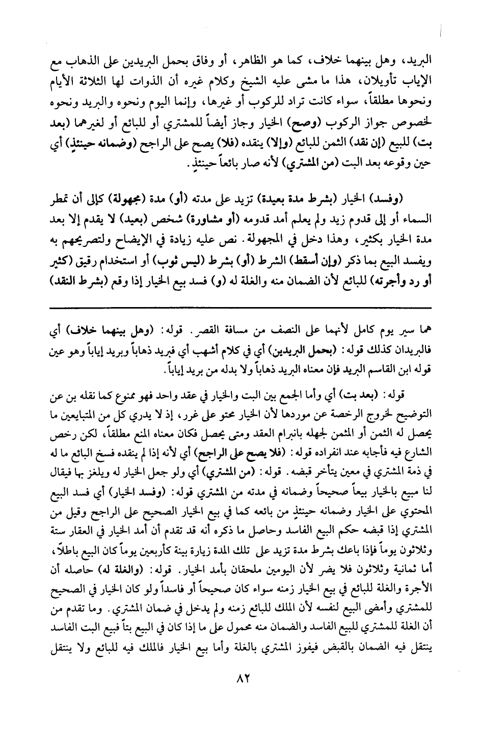 قوله : 16 ( بعد بت ) : أي وأما الجمع بين البت والخيار في عقد واحد . فهو ممنوع كما نقله ( بن ) عن التوضيح لخروج الرخصة عن موردها ، لأن الخيار محتو على غرر إذ لا يدري كل من المتبايعين ما يحصل له هل الثمن أو المثمن لجهله بانبرام العقد ومتى يحصل فكان مقتضاه المنع مطلقاً ، لكن رخص الشارع فيه فأباحه عند انفراده .