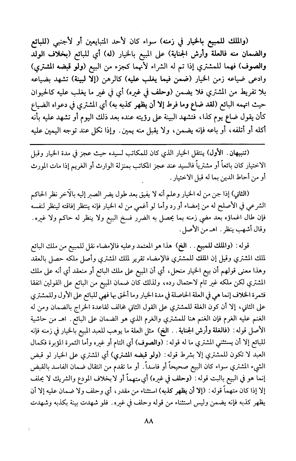قوله : 16 ( والملك للمبيع ) إلخ : هذا هو المعتمد ، عليه فالإمضاء نقل للمبيع من ملك البائع لملك المشتري . وقيل : إن الملك للمشتري فالإمضاء تقرير لملك المشتري وأصل ملكه حصل بالعقد ، وهذا معنى قولهم : إن بيع الخيار منحل ، أي أن المبيع على ملك البائع أو منعقد أي أنه على ملك المشتري لكن ملكه له غير تام لاحتمال رده . ولذلك كان ضمان المبيع من البائع على القولين اتفاقاً . فثمرة الخلاف إنما هي في الغلة الحاصلة في مدة الخيار وما ألحق بها ، فهي للبائع على الأول وللمشتري على الثاني . إلا أن كون الغلة للمشتري على القول الثاني مخالف لقاعدة : الخراج بالضمان و : من له الغنم عليه الغرم فإن الغنم هنا للمشتري والغرم الذي هو الضمان على البائع اه من حاشية الأصل .