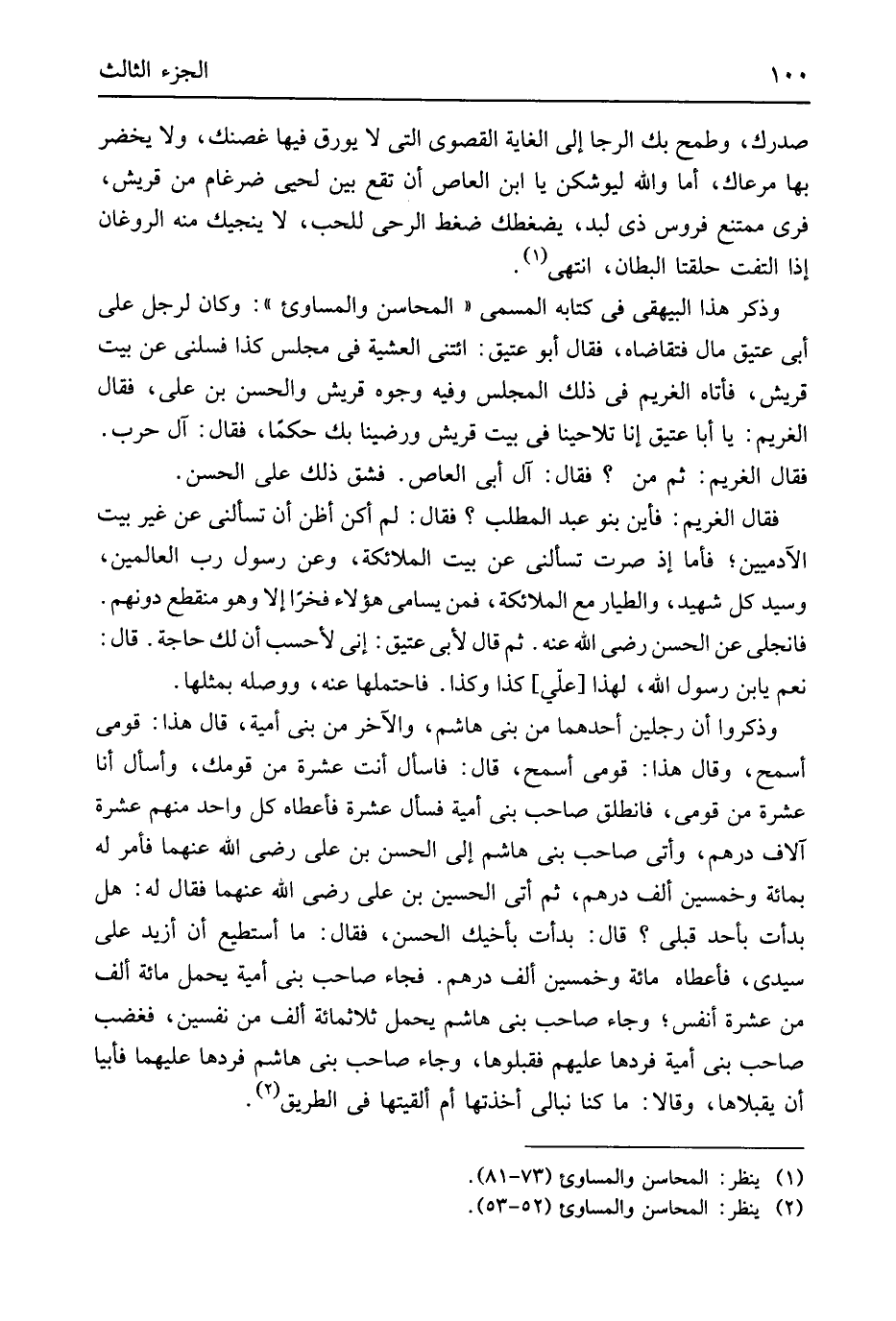 صدرك وطمح بك الرجا إِلَى الْغَايَة القصوى الَّتِي لَا يورق فِيهَا غصنك وَلَا يخضر بهَا مرعاك أما وَالله ليوشكن يَا ابْن الْعَاصِ أَن تقع بَين لحيي ضرغام من قُرَيْش فري مُمْتَنع فروس ذِي لبد يضغطك ضغط الرَّحَى للحب لَا ينجيك مِنْهُ الروغان إِذا الْتفت حلقتا البطان انْتهى وَذكر هَذَا الْبَيْهَقِيّ فِي كِتَابه الْمُسَمّى المحسن والمساوئ وَكَانَ لرجل على أبي عَتيق مَال فتقاضاه فَقَالَ أَبُو عَتيق ائْتِنِي العشية فِي مجْلِس كَذَا فسلني عَن بَيت قُرَيْش فَأَتَاهُ الْغَرِيم فِي ذَلِك الْمجْلس وَفِيه وُجُوه قُرَيْش وَالْحسن بن عَليّ فَقَالَ الغلايم يَا أَبَا عَتيق إِنَّا تلاحينا فِي بَيت قُرَيْش ورضينا بك حكما فَقَالَ آل حَرْب فَقَالَ الْغَرِيم ثمَّ من فَقَالَ آل أبي الْعَاصِ فشق ذَلِك على الْحسن فَقَالَ الْغَرِيم فَأَيْنَ بَنو عبد الْمطلب فَقَالَ لم أكن أَظن أَن تَسْأَلنِي عَن غير بَيت الْآدَمِيّين فَأَما إِذْ صرت تَسْأَلنِي عَن بَيت الْمَلَائِكَة وَعَن رَسُول رب الْعَالمين وَسيد كل شَهِيد والطيار مَعَ الْمَلَائِكَة فَمن يسامي هَؤُلَاءِ فخراً إِلَّا وَهُوَ مُنْقَطع دونهم فانجلي عَن الْحسن رَضِي الله عَنهُ ثمَّ قَالَ لأبي عَتيق إِنِّي لأحسب أَن لَك حَاجَة قَالَ نعم يَا بن رَسُول الله لهَذَا عَليّ كَذَا وَكَذَا فاحتملها عَنهُ وَوَصله بِمِثْلِهَا وَذكروا أَن رجلَيْنِ أَحدهمَا من بني هَاشم وَالْآخر من بني أُميَّة قَالَ هَذَا قومِي أسمح وَقَالَ هَذَا قومِي أسمح قل فاسأل أَنْت عشرَة من قَوْمك وأسأل أَنا عشرَة من قومِي فَانْطَلق صَاحب بني أمبة فَسَأَلَ عشرَة فَأعْطَاهُ كل وَاحِد مِنْهُم عشرَة آلَاف دِرْهَم وأتى صَاحب بني هَاشم إِلَى الْحسن بن عَليّ رَضِي الله عَنْهُمَا فَأمر لَهُ بِمِائَة وَخمسين ألف دِرْهَم ثمَّ أَتَى الْحُسَيْن بن عَليّ رَضِي الله عَنْهُمَا فَقَالَ لَهُ هَل بدأت بِأحد قبلي قَالَ بدأت بأخيك الْحسن فَقَالَ مَا أَسْتَطِيع أَن أَزِيد على سَيِّدي فَأعْطَاهُ مائَة وَخمسين ألف دِرْهَم فجَاء صَاحب بني أُميَّة يحمل مائَة ألف من عشرَة أنفس وَجَاء صَاحب بني هَاشم يحمل ثَلَاثمِائَة ألف من نفسين فَغَضب صَاحب بني أُميَّة فَردهَا عَلَيْهِم فقبلوها وَجَاء صَاحب بني هَاشم فَردهَا عَلَيْهِمَا فأبيا أَن يقبلاها وَقَالا مَا كُنَّا نبالي أَخَذتهَا أم ألقيتها فِي الطَّرِيق