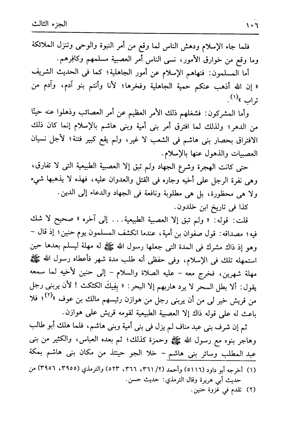 إِن الله أذهب عَنْكُم حمية الْجَاهِلِيَّة وَفَخْرهَا لأَنا وَأَنْتُم بَنو آدم مآدم من تُرَاب وَأما الْمُشْركُونَ فشغلهم ذَلِك الْأَمر الْعَظِيم عَم أَمر العصائب وذهلوا عَنهُ حينا من الدَّهْر وَلذَلِك افترق أَمر بني أُميَّة وَبني هَاشم بِالْإِسْلَامِ إِنَّمَا كَانَ ذَلِك الِافْتِرَاق بحصار بني هَاشم فِي الشّعب لَا غير وَلم يَقع كَبِير فتْنَة لأجل نِسْيَان العصبيات والذهول عَنْهَا بِالْإِسْلَامِ حَتَّى كَانَت الْهِجْرَة وَشرع الْجِهَاد وَلم تبْق إِلَّا العصبية الطبيعية الَّتِي لَا تفارق وَهِي نفرة الرجل على أَخِيه وجاره فِي الْقَتْل والعدوان عَلَيْهِ فَهَذِهِ لَا يذهبها شَيْء وَلَا هِيَ محظورة بل هِيَ مَطْلُوبَة ونافعة فِي الْجِهَاد وَالدُّعَاء إِلَى الدّين كَذَا فِي تَارِيخ ابْن خلدون قلت قَوْله وَلم تبْق إِلَّا العصبية الطبيعية إِلَى آخِره صَحِيح لَا شكّ فِيهِ مصداقه قَول صَفْوَان بن أُميَّة عِنْدَمَا انْكَشَفَ الْمُسلمُونَ يَوْم حنين إِذْ قَالَ وَهُوَ إِذْ ذَاك مُشْرك فِي الْمدَّة الَّتِي جعلهَا رَسُول الله
