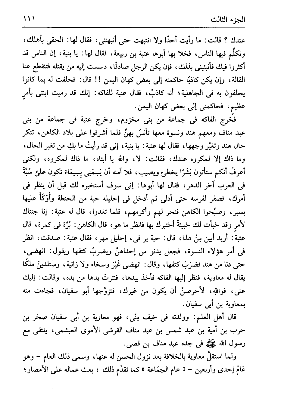 عنْدك قَالَت مَا رَأَيْت أحدا وَلَا انْتَبَهت حَتَّى أنبهتني فَقَالَ لَهَا الحقي بأهلك وَتكلم فِيهَا النَّاس فَخَلا بهَا أَبوهَا عتبَة بن ربيعَة فَقَالَ لَهَا يَا بنية إِن النَّاس قد أَكْثرُوا فِيك فأنبئيني بذلك فَإِن يكن الرجل صادقَاً دسست إِلَيْهِ من يقْتله فتنقطع عَنَّا القالة وَإِن يكن كَاذِبًا حاكمته إِلَى بعض كهان الْيمن قَالَ فَحَلَفت لَهُ بِمَا كَانُوا يحلفُونَ بِهِ فِي الْجَاهِلِيَّة أَنه كاذبٌ فَقَالَ عتبَة للفاكه إِنَّك قد رميت ابْنَتي بأمرٍ عظيمٍ فحاكمني إِلَى بعض كهان الْيمن فَخرج الْفَاكِه فِي جمَاعَة من بني مَخْزُوم وَخرج عتبَة فِي جمَاعَة من بني عبد منَاف وَمَعَهُمْ هِنْد ونسوة مَعهَا تأنسُ بِهن فَلَمَّا أشرفوا على بِلَاد الكاهن تنكر حَال هِنْد وَتغَير وَجههَا فَقَالَ لَهَا عتبَة يَا بنية إِنِّي قد رأيتُ مَا بكِ من تغير الْحَال وَمَا ذَاك إِلَّا لمكروه عنْدك فَقَالَت لَا وَالله يَا أبتاه مَا ذَاك لمكروه وَلَكِنِّي أعرفُ أَنكُمْ ستأتون بَشَراً يُخطئ ويصيب فَلَا آمنهُ أَن يَسِمَنِي بِسِيمَاءَ تكون عليَ سُبة فِي الْعَرَب آخر الدَّهْر فَقَالَ لَهَا أَبوهَا إِنِّي سَوف أستخبره لَك قبل أَن ينظر فِي أَمرك فصفر لفرسه حَتَّى أدلى ثمَّ أَدخل فِي إحليله حَبَّة من الْحِنْطَة وأَوْكَأَ عَلَيْهَا بسير وصبحوا الكاهن فَنحر لَهُم وَأكْرمهمْ فَلَمَّا تغدوا قَالَ لَهُ عتبَة إِنَّا جئْنَاك لأمرِ وَقد خبأت لَك خبيئة أختبرك بهَا فَانْظُر مَا هُوَ قَالَ الكاهن بُرة فِي كمرة قَالَ عتبَة أُرِيد أبين مِن هَذَا قَالَ حَبَّة بر فِي إحليل مهر فَقَالَ عتبَة صدقت انْظُر فِي أَمر هَؤُلَاءِ النسْوَة فَجعل يدنو من إحداهنَ ويضربُ كتفها وَيَقُول انهضي حَتَّى دنا من هِنْد فضرَبَ كتفها وَقَالَ انهضي غَيْرَ وسخاء وَلَا زَانِيَة وستلدينَ ملكا يُقَال لَهُ مُعَاوِيَة فَنظر إِلَيْهَا فاكه فَأخذ بِيَدِهَا فنترتْ يَدهَا من يَده وَقَالَت إِلَيْك عني فواللِّه لأحرصن أَن يكون من غَيْرك فتزوَجها أَبُو سُفْيَان فَجَاءَت مِنْهُ بِمُعَاوِيَة بن أبي سُفْيَان قَالَ أهل الْعلم وولدته فِي خيف مِني فَهُوَ مُعَاوِيَة بن أبي سُفْيَان صَخْر بن حَرْب بن أُميَّة بن عبد شمس بن عبد منَاف الْقرشِي الْأمَوِي العبشمي يلتقي مَعَ رَسُول الله