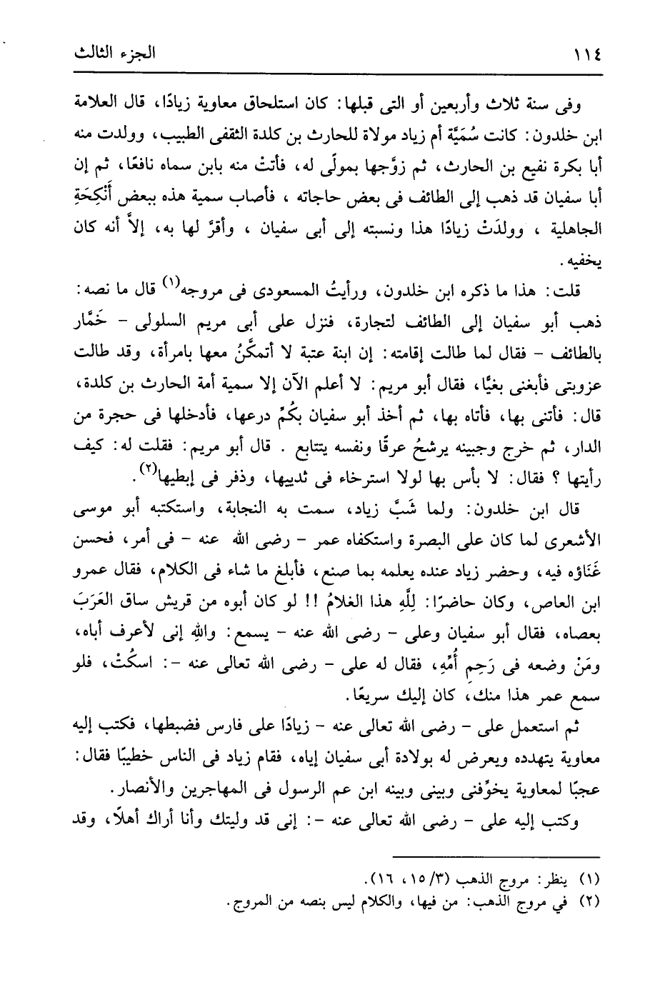 وَفِي سنة ثَلَاث وَأَرْبَعين أَو الَّتِي قبلهَا كَانَ استلحاق مُعَاوِيَة زيادَاً قَالَ الْعَلامَة ابْن خلدون كَانَت سُمَية أم زِيَاد مولاة لِلْحَارِثِ بن كلدة الثَّقَفِيّ الطَّبِيب وَولدت مِنْهُ أَبَا بكرَة نفيع بن الْحَارِث ثمَّ زَوجهَا بمولى لَهُ فأتتْ مِنْهُ بِابْن سَمَّاهُ نَافِعًا ثمَّ إِن أَبَا سُفْيَان قد ذهب إِلَى الطَّائِف فِي بعض حاجاته فَأصَاب سميَّة هَذِه بِبَعْض أَنكِحَةِ الْجَاهِلِيَّة وولدَت زياداً هَذَا ونسبته إِلَى أبي سُفْيَان وأقرَ لَهَا بِهِ إِلَّا أَنه كَانَ يخفيه قلت هَذَا مَا ذكره ابْن خلدون ورأيتُ المَسْعُودِيّ فِي مروجه قَالَ مَا نَصه ذهب أَبُو سُفْيَان إِلَى الطَّائِف لتِجَارَة فَنزل على أبي مَرْيَم السَّلُولي خَمار بِالطَّائِف فَقَالَ لما طَالَتْ إِقَامَته إِن ابْنة عتبَة لَا أتمكنُ مَعهَا بِامْرَأَة وَقد طَالَتْ عزوبتي فأبغني بغياً فَقَالَ أَبُو مَرْيَم لَا أعلم الْآن إِلَّا سميَّة أمة الْحَارِث بن كلدة قَالَ فأتني بِهِ فَأَتَاهُ بهَا ثمَّ أَخذ أَبُو سُفْيَان بكُم درعها فَأدْخلهَا قي حجرَة من الدَّار ثمَّ خرج وجبينه يرشحُ عرقاً وَنَفسه يتتابع قَالَ أَبُو مَرْيَم فَقلت لَهُ كَيفَ رَأَيْتهَا فَقَالَ لَا بَأْس بهَا لَوْلَا استرخاء فِي ثدييها وذفر فِي إبطيها قَالَ ابْن خلدون وَلما شَب زِيَاد سمت بِهِ النجابة واستكتبه أَبُو مُوسَى الْأَشْعَرِيّ لما كَانَ على الْبَصْرَة واستكفاه عمر رَضِي لله عَنهُ فِي أَمر فَحسن غَنَاؤه فِيهِ وَحضر زِيَاد عِنْده يُعلمهُ بِمَا صنع فأبلغ مَا شَاءَ فِي الْكَلَام فَقَالَ عَمْرو ابْن الْعَاصِ وَكَانَ حَاضرا لِلَهِ هَذَا الغلامُ لَو كَانَ أَبوهُ من قُرَيْش سَاق العَرَبَ بعصاه فَقَالَ أَبُو سُفْيَان وَعلي رَضِي الله عَنهُ يسمع واللِّه إِنِّي لأعرف أَبَاهُ ومَنْ وَضعه فِي رحم أمه فَقل لَهُ عَليّ رَضِي الله تَعَالَى عَنهُ اسكُتْ فَلَو سمع عمر هَذَا مِنْك كَانَ إِلَيْك سَرِيعا ثمَّ اسْتعْمل عَليّ رَضِي الله تَعَالَى عَنهُ زيدا على فَارس فضبطها فَكتب إِلَيْهِ مُعَاوِيَة يتهدده ويعرض لَهُ بِوِلَادَة أبي سُفْيَان إِيَّاه فَقَامَ زِيَاد فِي النَّاس خَطِيبًا فَقَالَ عجبا لمعاوية يخوفني وبيني وَبَينه ابْن عَم الرَّسُول فِي لمهاجرين وَالْأَنْصَار وَكتب إِلَيْهِ عَليّ رَضِي الله تَعَالَى عَنهُ إِنِّي قد وليتك وَأَنا أَرَاك أَهلا وَقد