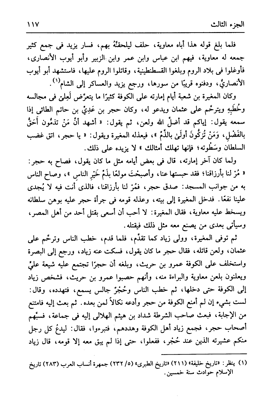 فَلَمَّا بلغ قَوْله هَذَا أَبَاهُ مُعَاوِيَة حلف ليلحقنهُ بهم فَسَار يزِيد فِي جمع كثير جمعه لَهُ مُعَاوِيَة فيهم ابْن عَبَّاس وَابْن عمر وَابْن الزبير وَأَبُو أَيُّوب الْأنْصَارِيّ فأوغلوا فِي بِلَاد الرّوم وبلغوا الْقُسْطَنْطِينِيَّة وقاتلوا الرّوم عَلَيْهَا فاستشهد أَبُو أَيُّوب الْأنْصَارِيّ ودفنوه قَرِيبا من سورها وَرجع يزِيد والعساكر إِلَى الشَّام وَكَانَ الْمُغيرَة بن شُعْبَة أَيَّام إمارته على الْكُوفَة كثير مَا يتَعَرَّض لَعِلي فِي مجالسه وخُطَبِهِ ويترحم على عُثْمَان وَيَدْعُو لَهُ وَكَانَ حجر بن عَدِي بن حَاتِم الطَّائِي إِذا سَمعه يَقُول إيَّاكُمْ قد أضلّ الله وَلعن ثمَّ يَقُول أشهد أنَّ مَن تذمون أَحَقُّ بالفَضلِ وَمَن تُزكونَ أولَى بالذم فيعذله الْمُغيرَة وَيَقُول يَا حجر اتَّقِ غضب السُّلْطَان وسَطوته فَإِنَّهَا تهْلك أمثالك لَا يزِيدهُ على ذَلِك وَلما كن آخر إمارته قَالَ فِي بعض أَيَّامه مثل مَا كَانَ يَقُول فصاح بِهِ حجر مُر لنا بأرزاقنا فقد حبستها عَنَّا وأصبحتَ مولعَاً بذم خير النَّاس وَصَحَّ النَّاس بِهِ من جَوَانِب الْمَسْجِد صدق حجر فمُر لنا بأرزاقنا فَالَّذِي أَنْت فِيهِ لَا يُجدي علينا نفعا فَدخل الْمُغيرَة إِلَى بَيته وعذله قومه فِي جرْأَة حجر عَلَيْهِ بوهن سُلْطَانه ويسخط عَلَيْهِ مُعَاوِيَة فَقَالَ الْمُغيرَة لَا أحب أَن أسعى يقتل أحد من أهل الْمصر وَسَيَأْتِي بعدِي من يصنع مَعَه مثل ذَلِك فيقتله ثمَّ توفّي الْمُغيرَة وَولى زِيَاد كَمَا تقدم فَلَمَّا قدم خطب النَّاس وترحَم على عُثْمَان وَلعن قَاتله فَقَالَ حجر مَا كَانَ يَقُول فَسكت عَنهُ زِيَاد وَرجع إِلَى الْبَصْرَة واستخلف على الْكُوفَة عَمْرو بن حُرَيْث وبلغه أَن حجرا تَجْتَمِع عَلَيْهِ شيعَة عَليّ ويعلنون بلعن مُعَاوِيَة والبراءة مِنْهُ وَأَنَّهُمْ حصبوا عَمْرو بِمَ حُرَيْث فشخص زِيَاد إِلَى الْكُوفَة حَتَّى دَخلهَا ثمَّ خطب النَّاس وحُجرٌ جَالس يسمع فتهدده وَقَالَ لست بِشَيْء إِن لم أمنع الْكُوفَة من حجر وأدعه نكالا لمن بعده ثمَّ بعث إِلَيْهِ فَامْتنعَ من الْإِجَابَة فَبعث صَاحب الشرطة شَدَّاد بن هَيْثَم الْهِلَالِي إِلَيْهِ فِي جمَاعَة فسبهم أَصْحَاب حجر فَجمع زِيَاد أهل الْكُوفَة وهددهم فتبرءوا فَقَالَ ليَدع كل رجل مِنْكُم عشيريه الَّذين عِنْد حُجر فَفَعَلُوا حَتَّى إِذا لم يبْق مَعَه إِلَّا قومه قَالَ زِيَاد