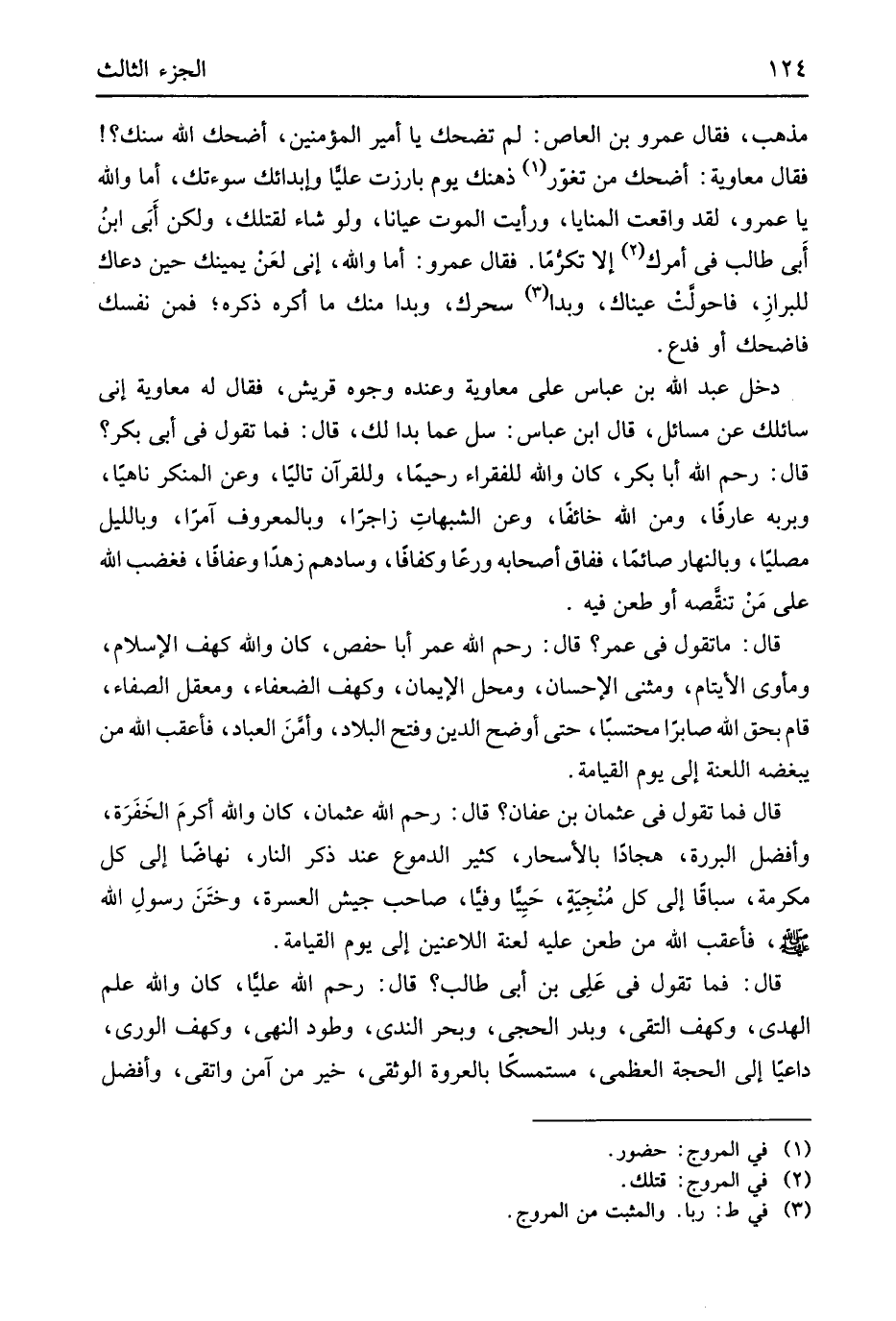 مَذْهَب فَقَالَ عَمْرو بن الْعَاصِ لم تضحك يَا أَمِير الْمُؤمنِينَ أضْحك الله سنك فَقَالَ مُعَاوِيَة أضْحك من تغور ذهنك يَوْم بارزت عليا وإبدائك سوءتك أمل وَالله يَا عَمْرو لقد واقعت لمنايا وَرَأَيْت الْمَوْت عيَانًا وَلَو شَاءَ لقتلك وَلَكِن أبي ابنُ أبي طَالب فِي أَمرك إِلَّا تكرماً فَقَالَ عَمْرو أما وَالله إِنِّي لعَن يَمِينك حِين دعَاك للبرازِ فاحولت عَيْنَاك وبدا سحرك وبدا مِنْك مَا أكره ذكره فَمن نَفسك فاضحك أَو فدع دخل عبد الله بن عَبَّاس على مُعَاوِيَة وَعِنْده وُجُوه قُرَيْش فَقَالَ لَهُ مُعَاوِيَة إِنِّي سَائِلك عَن مسَائِل قَالَ ابْن عَبَّاس سل عَمَّا بدا لَك قَالَ فَمَا تَقول فِي أبي بكر قَالَ رحم الله أَبَا بكر كَانَ وَالله للْفُقَرَاء رحِيما وللقرآن تالياً وَعَن الْمُنكر ناهياً وبربه عَارِفًا وَمن الله خَائفًا وَعَن الشبهاتِ زاجرَاً وبالعروف آمراً وبالليل مُصَليا وبالنهار صَائِما ففاق أَصْحَابه ورعاه وكفافَاً وسادهم زهداً وعفافاً فَغَضب الله على مَن تنقصه أَو طعن فِيهِ قَالَ مَا تَقول فِي عمر قَالَ رحم الله عمر أَبَا حَفْص كَانَ وَالله كَهْف الْإِسْلَام ومأوى الْأَيْتَام ومثنى الْإِحْسَان وَمحل الْإِيمَان وكهف الضُّعَفَاء وَمَعْقِل الصفاء قَامَ بِحَق الله صَابِرًا محتسباً حَتَّى أوضح الدّين وَفتح الْبِلَاد وأمنَ الْعباد فأعقب الله من يبغضه اللَّعْنَة إِلَى يَوْم الْقِيَامَة قَالَ فَمَا تَقول فِي عُثْمَان بن عَفَّان قَالَ رحم الله عُثْمَان كَانَ وَالله أكرمَ الخَفَرَة وَأفضل البررة هجاداً بالأسحار كثير الدُّمُوع عِنْد ذكر النَّار نهاضاً إِلَى كل مكرمَة سباقا إِلَى كل فنجيه حَيِياً وفياً صَاحب جَيش الْعسرَة وختَنَ رسولِ الله