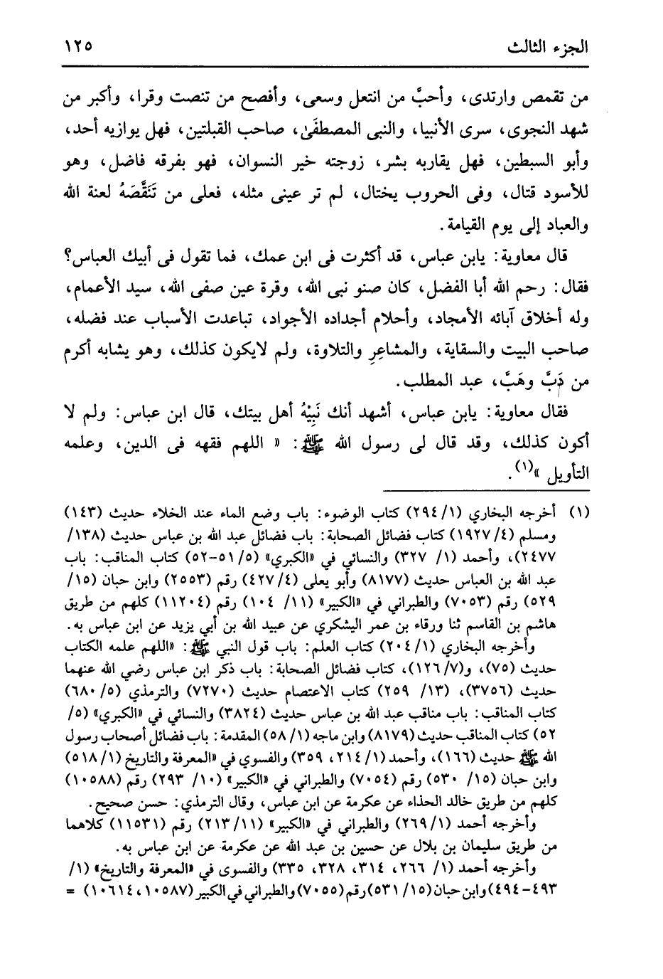 من تقمص وارتدى وَأحب من انتعل وسعى وأفصح من تنصت وقرا وأكبر من شهد النَّحْوِيّ سرى الْأَنْبِيَاء وَالنَّبِيّ المصطفَى صَاحب الْقبْلَتَيْنِ فَهَل يوازيه أحد وَأَبُو السبطين فَهَل يُقَارِبه بشر زَوجته خير النسوان فَهُوَ بفرقه فَاضل وَهُوَ للأسود قتال وَفِي الحروب يختال لم تَرَ عَيْني مثله فعلى من تَنَقصَهُ لعنة الله والعباد إِلَى يَوْم الْقِيَامَة قَالَ مُعَاوِيَة يَا بن عَبَّاس قد أكثرت فِي ابْن عمك فَمَا تَقول فِي أَبِيك الْعَبَّاس فَقَالَ رحم الله أَبَا الْفضل كَانَ صنو نَبِي لله وقرة عين صفي الله سيد الْأَعْمَام وَله أَخْلَاق آبَائِهِ الأمجاد وأحلام أجداده الأجواد تَبَاعَدت الْأَسْبَاب عِنْد فَضله صَاحب الْبَيْت والسقاية والمشاعِرِ والتلاوة وَلم لَا يكون كَذَلِك وَهُوَ يشابه أكْرم من دَب وهَب عبد الْمطلب فَقَالَ مُعَاوِيَة يَا بن عَبَّاس أشهد أَنَّك بنيه أهل بَيْتك قَالَ ابْن عَبَّاس وَلم لَا أكون كَذَلِك وَقد قَالَ لي رَسُول الله