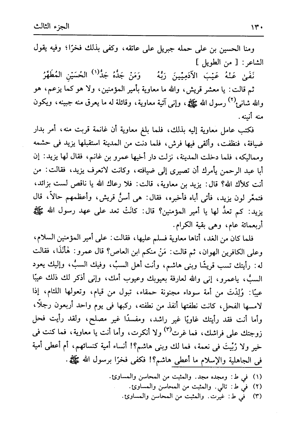 أَرْبَعمِائَة عَام وَهِي بَقِيَّة الْكِرَام فَلَمَّا كَانَ من الْغَد أَتَاهَا مُعَاوِيَة فَسلم عَلَيْهَا فَقَالَت على أَمِير الْمُؤمنِينَ السَّلَام وعَلى الْكَافرين الهوان ثمَّ قَالَت مَنْ مِنْكُم ابْن الْعَاصِ قَالَ عَمْرو هانذا فَقَالَت لَهُ رَأَيْتُك تسب قُريْشًا وَبني هَاشم وَأَنت أهل السب وفيك السب وَإِلَيْك يعود السبُّ يَا عَمْرو إِنِّي وَالله لعارفة بعيوبك وعيوب أمك وَإِنِّي أذكر لَك ذَلِك عيبَاً عَيْبا وُلدْتَ من أمة سَوْدَاء مَجْنُونَة حمقاء تبول من قيام وتعولها اللئام إِذا لَا مَسهَا الْفَحْل كَانَت نطفتها أنفذ من نطفته ركبهَا فِي يَوْم وَاحِد أَرْبَعُونَ رجلا وَمَا أَنْت فقد رَأَيْتُك غاويَاً غير رَاشد ومفسداً غير مصلح وَلَقَد رَأَيْت فَحل زَوجتك على فراشك فَمَا غرت وَلَا أنْكرت وَأما أَنْت يَا مُعَاوِيَة فَم كنت فِي خير وَلَا ربيب فِي نعْمَة فَمَا لَك وَبني هَاشم أنساء أُميَّة كنسائهم أم أعْطى أُميَّة فِي الْجَاهِلِيَّة وَالْإِسْلَام مَا أعْطى هَاشم فكفي فخراً برَسُول الله