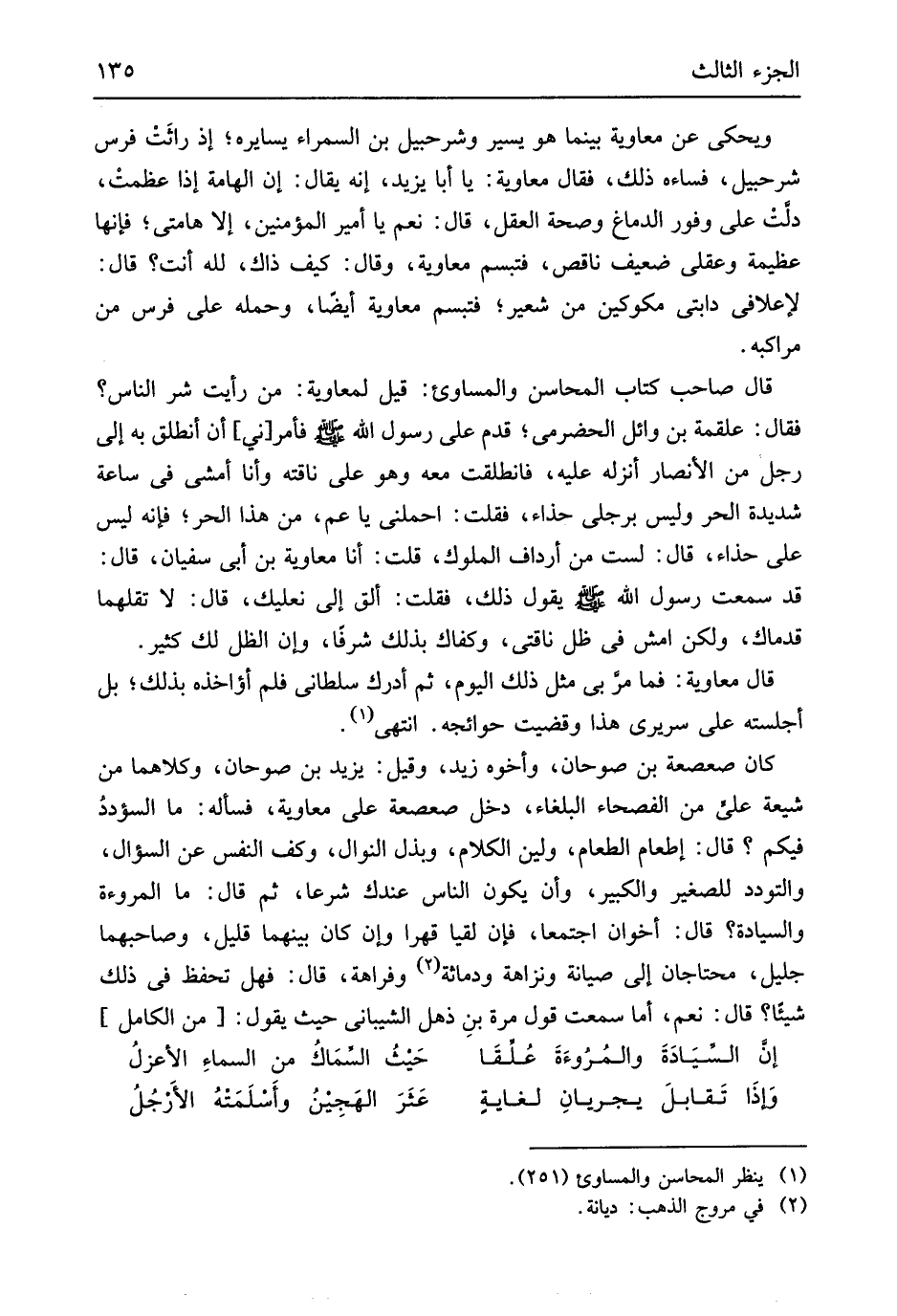 يَقُول ذَلِك فَقلت ألق إِلَيّ نعليك قَالَ لَا تقلهما قدمك وَلَكِن امش فِي ظلّ نَاقَتي وَكَفاك بذلك شرفاً وَإِن الظل لَك كثير قَالَ مُعَاوِيَة فَمَا مرَ بِي مثل ذَلِك الْيَوْم ثمَّ أدْرك سلطاني فَلم أؤاخذه بذلك بل أجلسته على سَرِيرِي هَذَا وقضيت حَوَائِجه انْتهى كَانَ صعصعة بن صوحان وَأَخُوهُ زيد وَقيل يزِيد بن صوحان وَكِلَاهُمَا شيعَة عَليّ من الفصحاء البلغاء دخل صعصعة على مُعَاوِيَة فَسَأَلَهُ مَا السؤدد فِيكُم قَالَ إطْعَام الطَّعَام ولين الْكَلَام وبذل النوال وكف النَّفس عَن السُّؤَال والتودد للصَّغِير وَالْكَبِير وَأَن يكون النَّاس عنْدك شرعا ثمَّ قَالَ مَا الْمُرُوءَة والسيادة قَالَ أَخَوان اجْتمعَا فَإِن لقيا قهرا وَإِن كَانَ بَينهمَا قَلِيل وصاحبهما جليل محتاجان إِلَى صِيَانة ونزاهة ودماثة وفراهة قَالَ فَهَل تحفظ فِي ذَلِك شَيْئا قَالَ نعم أما سَمِعت قَول مرّة بنِ ذهل الشَّيْبَانِيّ حَيْثُ يَقُول // (من الْكَامِل) //