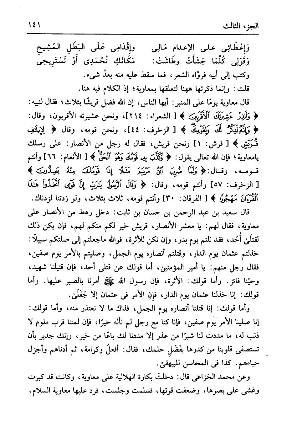 وَكتب إِلَى أَبِيه فَرَوَاهُ الشّعْر فَمَا سقط عَلَيْهِ مِنْهُ بعدُ شَيْء قلت وَإِنَّمَا ذكرتها هَهُنَا لتعلقها بِمُعَاوِيَة إِذْ الْكَلَام فِيهِ هُنَا قَالَ مُعَاوِيَة يَوْمًا على الْمِنْبَر أَيهَا النَّاس إِن الله فضل قُريْشًا بِثَلَاث فَقَالَ لنَبيه {وَأنذر عشيرتك الْأَقْرَبين} الشُّعَرَاء 214 وَنحن عشريته الأقربون وَقَالَ {وَإنَّهُ لذكر لَك ولقومك} الزخرف 44 وَنحن قومه وَقَالَ {لإيلافِ قُرَيشٍ} قُرَيْش 1 وَنحن قُرَيْش فَقَالَ لَهُ رجل من الْأَنْصَار على رسلك يَا مُعَاوِيَة فَإِن الله تَعَالَى يَقُول {وكذبَ بِه قَومُكَ وَهُو اَلحق} الْأَنْعَام 66 وَأَنْتُم قومه وَقَالَ {وَلمَا ضرِبَ ابنُ مَريَمَ مَثَلا إِذَا قَومك مِنهُ يصدُّون} الزخرف 57 وَأَنْتُم قومه وَقَالَ {وَقَالَ اَلرسول يَا رب إِن قومِي اتَّخذُوا هَذَا القرءان مَهْجُورًا} الْفرْقَان 30 وَأَنْتُم قومه ثَلَاث بِثَلَاث وَلَو زدتنا لزدناك قَالَ سعيد بن عبد الرَّحْمَن بن حسان بن ثَابت دخل رَهْط من الْأَنْصَار على مُعَاوِيَة فقّال لَهُم يَا معشر الْأَنْصَار قُرَيْش خير لكم مِنْكُم لَهُم فَإِن يكن ذَلِك لقتلَى أُحُد فقد نلتم يَوْم بدر وَإِن تكن للأثرة فوَاللَّه مَا جعلتم إِلَى صلتكم سَبِيلا خذلتم عُثْمَان يَوْم الدَّار وقتلتم أنصاره يَوْم الْجمل وصليتم بِالْأَمر يَوْم صفّين فَقَالَ رجل مِنْهُم يَا أَمِير الْمُؤمنِينَ أما قَوْلك عَن قَتْلَى أحد فَإِن قتيلنا شَهِيد وحينا فائز وَأما قَوْلك الأثرة فَإِن رَسُول الله