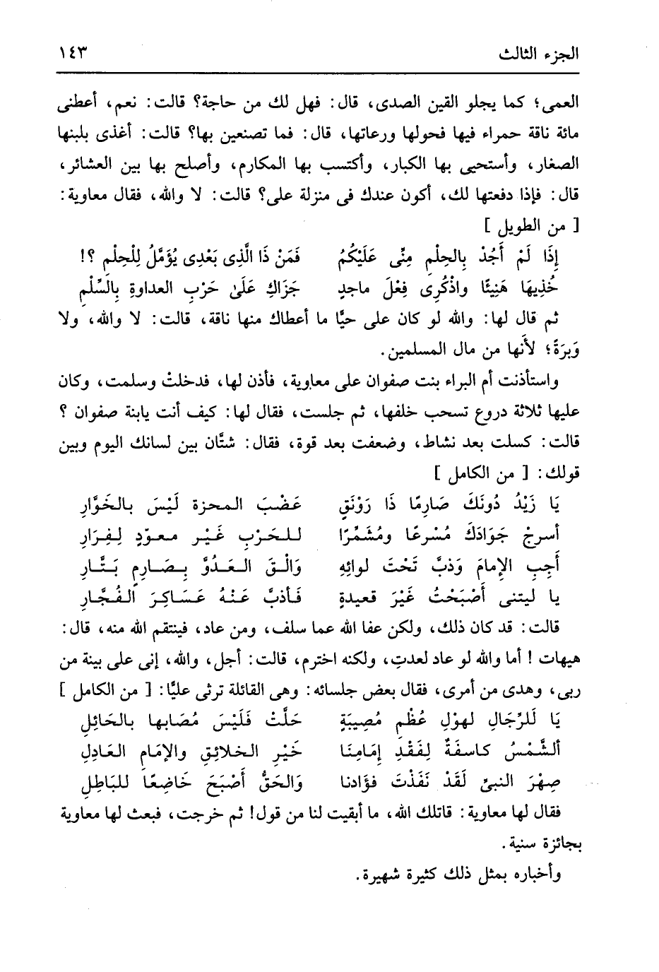 ثمَّ قَالَ لَهَا وَالله لَو كَانَ عَليّ حَيا مَا أَعْطَاك مِنْهَا نَاقَة قَالَت لَا وَالله وَلَا وَبرَة لأَنها من مَال الْمُسلمين واستأذنت أم الْبَراء بنت صَفْوَان على مُعَاوِيَة فَأذن لَهَا فدخلتْ وسلمت وَكَانَ عَلَيْهَا ثَلَاثَة دروع تسحب خلفهَا ثمَّ جَلَست فَقَالَ لَهَا كَيفَ أَنْت يابنة صَفْوَان قَالَت كسلت بعد نشاط وضعفت بعد قُوَّة فَقَالَ شتَان بَين لسَانك الْيَوْم وَبَين قَوْلك // (من الْكَامِل) //