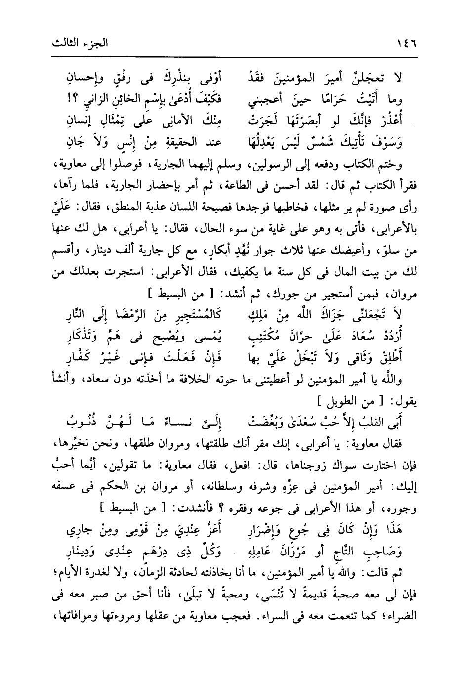 وَختم الْكتاب وَدفعه إِلَى الرسولين وَسلم إِلَيْهِمَا الْجَارِيَة فوصلوا إِلَى مُعَاوِيَة فَقَرَأَ الْكتاب ثمَّ قَالَ لقد أحسن فِي الطَّاعَة ثمَّ أَمر بإحضار الْجَارِيَة فَلَمَّا رَآهَا رأى صُورَة لم ير مثلهَا فخاطبها فَوَجَدَهَا فصيحة اللِّسَان عذبة الْمنطق فَقَالَ عَلَي بالأعرابي فَأتى بِهِ وَهُوَ على غَايَة من سوء الْحَال فَقَالَ يَا أَعْرَابِي هَل لَك عَنْهَا من سلو وأعيضك عَنهُ ثَلَاث جوَار نهد أَبْكَارًا مَعَ كل جَارِيَة ألف دِينَار وَأقسم لَك من بَيت لمَال فِي كل سنة مَا يَكْفِيك فَقل الْأَعرَابِي استجرت بعدلك من مَرْوَان فبمن أستجير من جورك ثمَّ أنْشد من // (الْبَسِيط) //