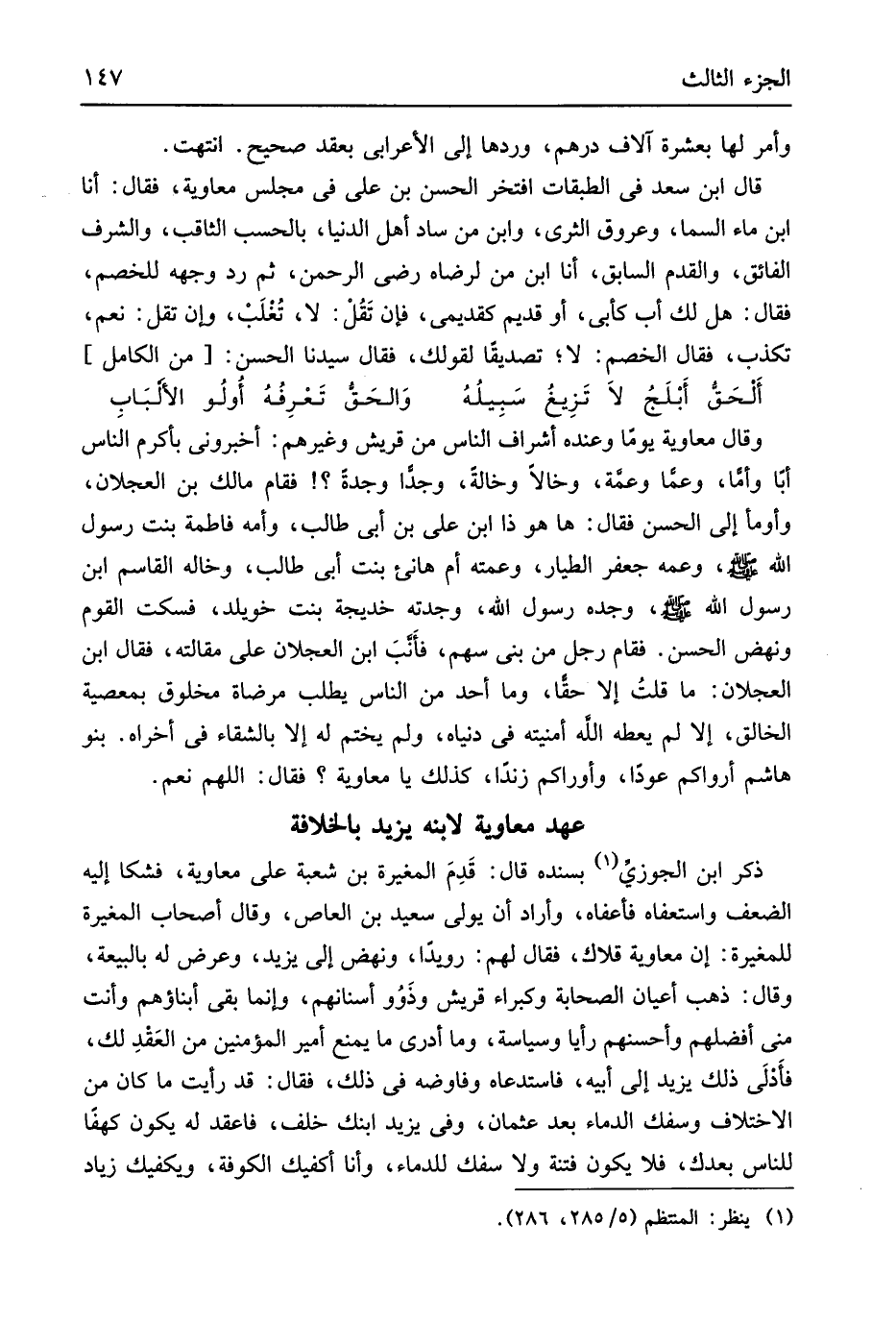 وجده رَسُول الله وجدته خَدِيجَة بنت خويلد فَسكت الْقَوْم ونهض الْحسن فَقَامَ رجل من بني سهم فأنبَ ابْن العجلان على مقَالَته فَقَالَ ابْن العجلان مَا قلتُ إِلَّا حقُّاً وَمَا أحد من النَّاس يطْلب مرضات مَخْلُوق بِمَعْصِيَة الْخَالِق إِلَّا لم يُعْطه الله أمْنِيته فِي دُنْيَاهُ وَلم يخْتم لَهُ إِلَّا بالشقاء فِي أخراه بَنو هَاشم أرواكم عوداً وأوراكم زنداً كَذَلِك يَا مُعَاوِيَة فَقَالَ اللَّهُمَّ نعم