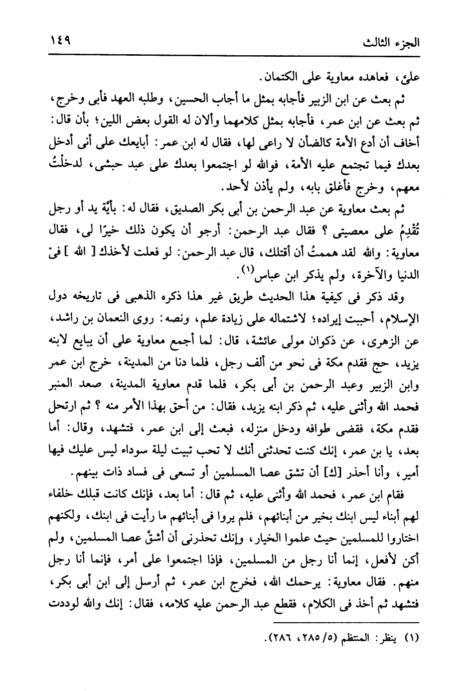 عَليّ فعاهده مُعَاوِيَة على الكتمان ثمَّ بعث عَن ابْن الزبير فَأَجَابَهُ بِمثل مَا أجَاب الْحُسَيْن وَطَلَبه الْعَهْد فَأبى وَخرج ثمَّ بعث عَن ابْن عمر فَأَجَابَهُ بِمثل كَلَامهمَا وألان لَهُ القَوْل بعض اللين بِأَن قَالَ أَخَاف أَن أدع الْأمة كالضأن لَا راعي لَهَا فَقَالَ لَهُ ابْن عمر أُبَايِعك على أَنِّي أَدخل بعْدك فِيمَا تَجْتَمِع عَلَيْهِ الْأمة فوَاللَّه لَو اجْتَمعُوا بعْدك على عبد حبشِي لدخلتُ مَعَهم وَخرج فأغلق بَابه وَلم يَأْذَن لأحد ثمَّ بعث مُعَاوِيَة عَن عبد الرَّحْمَن بن أبي بكر الصّديق فَقَالَ لَهُ بأية يَد أَو رجل تُقدِمُ على معصيتي فَقَالَ عبد الرَّحْمَن أَرْجُو أَن يكون ذَلِك خيرا لي فَقَالَ مُعَاوِيَة وَالله لقد هممتُ أَن أَقْتلك قَالَ عبد الرَّحْمَن لَو فعلت لأخذك الله فِي الدُّنْيَا وَالْآخِرَة وَلم يذكر ابْن عَبَّاس وَقد ذكر فِي كَيْفيَّة هَذَا الحَدِيث طَرِيق غير هَذَا ذكره الذَّهَبِيّ فِي تَارِيخه دوَل الْإِسْلَام أَحْبَبْت إِيرَاده لاشْتِمَاله على زِيَادَة علم وَنَصه روى النُّعْمَان بن رَاشد عَن الزُّهْرِيّ عَن ذكْوَان مولى عَائِشَة قَالَ لما أجمع مُعَاوِيَة على أَن يُبَايع لِابْنِهِ يزِيد حج فَقدم مَكَّة فِي نَحْو من ألف رجل فَلَمَّا دنا من الْمَدِينَة خرج ابْن عمر وَابْن الزبير وَعبد الرَّحْمَن بن أبي بكر فَلَمَّا قدم مُعَاوِيَة الْمَدِينَة صعد الْمِنْبَر فَحَمدَ الله وَأثْنى عَلَيْهِ ثمَّ ذكر ابْنه يزِيد فَقَالَ من أَحَق بِهَذَا الْأَمر مِنْهُ ثمَّ ارتحل فَقدم مَكَّة فَقضى طَوَافه وَدخل منزله فَبعث إِلَى ابْن عمر فَتشهد وَقَالَ أما بعد يَا بن عمر إِنَّك كنت تُحَدِّثنِي أَنَّك لَا تحب تبيت لَيْلَة سَوْدَاء لَيْسَ عَلَيْك فِيهَا أَمِير وَأَنا أحذرك أَن تشق عَصا الْمُسلمين أَو تسْعَى فِي فَسَاد ذَات بَينهم فَقَامَ ابْن عمر فَحَمدَ الله وَأثْنى عَلَيْهِ ثمَّ قَالَ أما بعد فَإنَّك كَانَت قبلك خلفاء لَهُم أَبنَاء لَيْسَ ابْنك بِخَير من أبنائهم فَلم يرَوا فِي أبنائهم مَا رَأَيْت فِي ابْنك وَلَكنهُمْ اخْتَارُوا للْمُسلمين حَيْثُ علمُوا الْخِيَار وَإنَّك تحذرني أَن أشق عَصا الْمُسلمين وَلم أكن لأَفْعَل إِنَّمَا أَنا رجل من الْمُسلمين فَإِذا اجْتَمعُوا على أَمر فَإِنَّمَا أَنا رجل مِنْهُم فَقَالَ مُعَاوِيَة يَرْحَمك الله فَخرج ابْن عمر ثمَّ أرسل إِلَى ابْن أبي بكر فَتشهد ثمَّ أَخذ فِي الْكَلَام فَقطع عبد الرَّحْمَن عَلَيْهِ كَلَامه فَقَالَ إِنَّك وَالله لَوَدِدْت