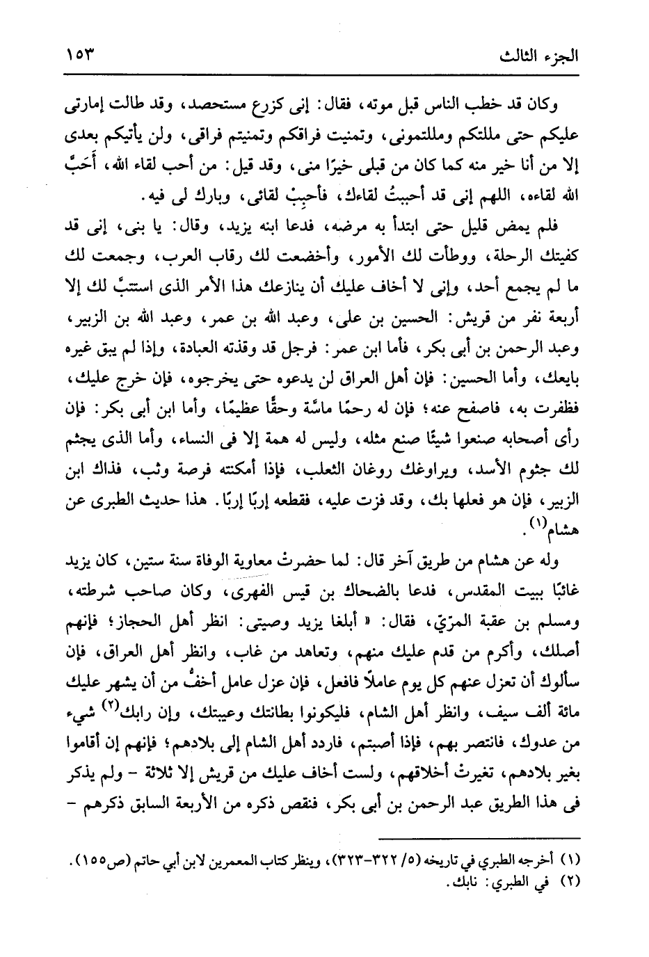 وَكَانَ قد خطب النَّاس قبل مَوته فَقَالَ إِنِّي كزرع مستحصد وَقد طَالَتْ إمارتي عَلَيْكُم حَتَّى مللتكم ومللتموني وتمنيت فراقكم وتمنيتم فراقي وَلنْ يأتيكم بعدِي إِلَّا من أَنا خير مِنْهُ كَمَا كَانَ من قبلي خيرَاً منى وَقد قيل من أحب لِقَاء الله أَحب الله لقاءه اللَّهُمَّ إِنِّي قد أحببتُ لقاءك فأحبب لقائي وَبَارك لي فِيهِ فَلم يمض قَلِيل حَتَّى ابْتَدَأَ بِهِ مَرضه فَدَعَا ابْنه يزِيد وَقَالَ يَا بني إِنِّي قد كفيتك الرحلة ووطأت لَك الْأُمُور وأخضعت لَك رِقَاب الْعَرَب وجمعت لَك مَا لم يجمع أحد وَإِنِّي أَخَاف عَلَيْك أَن ينازعك هَذَا الْأَمر الَّذِي استتب لَك إِلَّا أَرْبَعَة نفر من قُرَيْش الْحُسَيْن بن عَليّ وَعبد الله بن عمر وَعبد الله بن الزبير وَعبد الرَّحْمَن بن أبي بكر فَأَما ابْن عمر فَرجل قد وقذته الْعِبَادَة وَإِذا لم يبْق غَيره بَايَعَك وَأما الْحُسَيْن فَإِن أهل الْعرَاق لن يَدعُوهُ حَتَّى يخرجوه فَإِن خرج عَلَيْك فظفرت بِهِ فاصفح عَنهُ فَإِن لَهُ رحما ماسة وَحقا عَظِيما وَأما ابْن أبي بكر فَإِن رَأْي أَصْحَابه صَنَعُوا شَيْئا صنع مثله وَلَيْسَ لَهُ همة إِلَّا فِي النِّسَاء وَأما الَّذِي يجثم لَك جثوم الْأسد ويراوغك روغان الثَّعْلَب فَإِذا أمكنته فرْصَة وثب فَذَاك ابْن الزبير فَإِن هُوَ فعلهَا بك وَقد فزت عَلَيْهِ فَقَطعه إرباً إرباً هَذَا حَدِيث الطَّبَرِيّ عَن هِشَام وَله عَن هِشَام من طَرِيق آخر قَالَ لما حضرت مُعَاوِيَة الْوَفَاة سنة سِتِّينَ كَانَ يزِيد غَائِبا بِبَيْت الْمُقَدّس فَدَعَا بِالضحاكِ بن قيس الفِهري وَكَانَ صَاحب شرطته وَمُسلم بن عقبَة المري فَقَالَ أبلغا يزِيد وصيتي انْظُر أهل الْحجاز فَإِنَّهُم أصلك وَأكْرم من قدم عَلَيْك مِنْهُم وتعاهد من غَابَ وَانْظُر أهل الْعرَاق فَإِن سألوك أَن تعزل عَنْهُم كل يَوْم عَاملا فافعل فَإِن عزل عَامل أخف من أَن يشهر عَلَيْك مائَة ألف سيف وَانْظُر أهل الشَّام فليكونوا بطاتنك وعيبتك وَإِن رَابَك شَيْء من عَدوك فانتصر بهم فَإِذا أصبْتُم فاردد أهل الشَّام إِلَى بِلَادهمْ فَإِنَّهُم إِن أَقَامُوا بِغَيْر بِلَادهمْ تَغَيَّرت أَخْلَاقهم وَلست أَخَاف عَلَيْك من قُرَيْش إِلَّا ثَلَاثَة وَلم يذكر فِي هَذَا الطَّرِيق عبد الرَّحْمَن بن أبي بكر فنقص ذكره من الْأَرْبَعَة السَّابِق ذكرهم