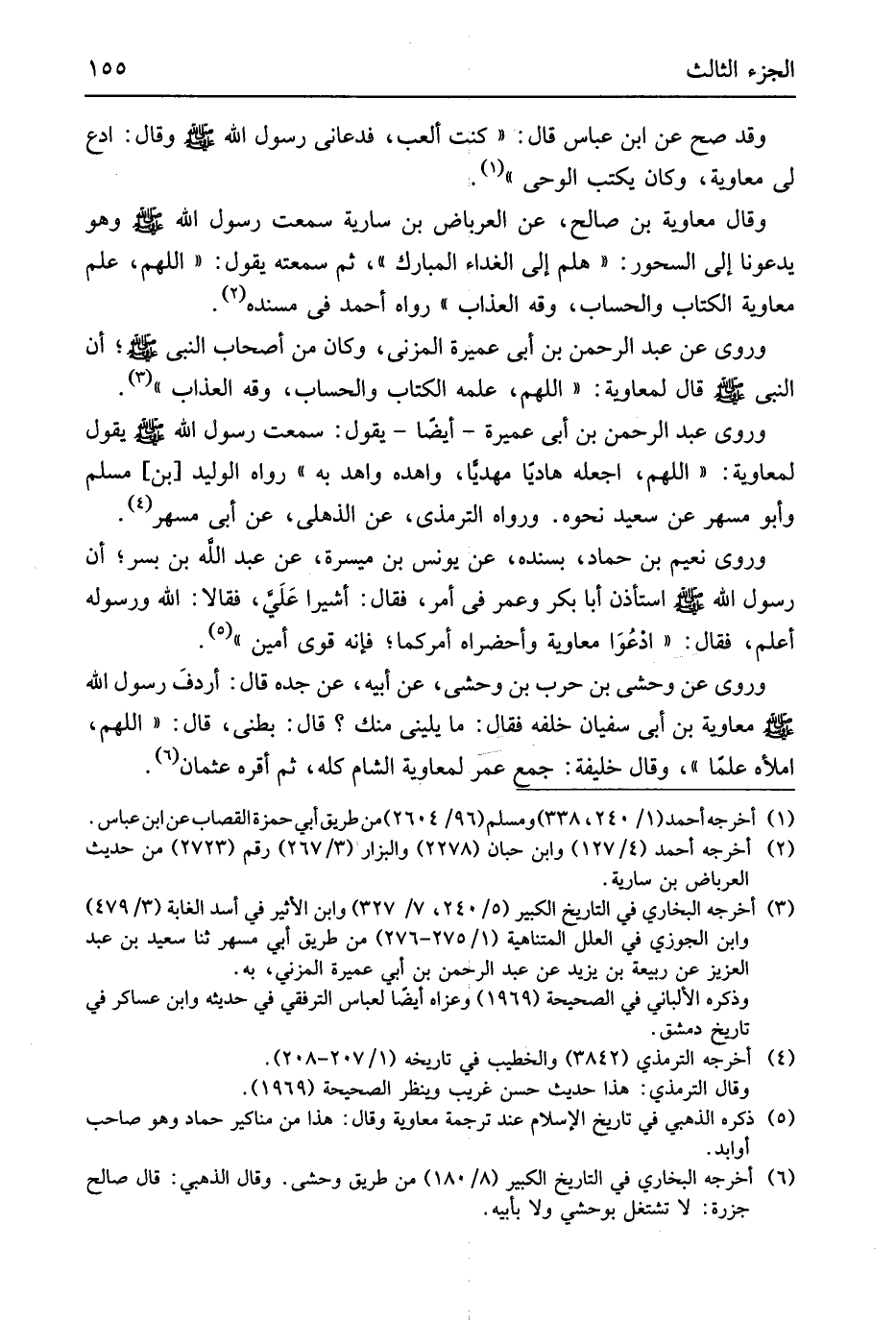 وَهُوَ يَدْعُونَا إِلَى السّحُور هَلُمَّ إِلَى الْغَدَاء الْمُبَارك ثمَّ سمعته يَقُول اللَّهُمَّ علم مُعَاوِيَة الْكتاب والحساب وقه الْعَذَاب رَوَاهُ أَحْمد فِي مُسْنده وروى عَن عبد الرَّحْمَن بن أبي عميرَة الْمُزنِيّ وَكَانَ من أَصْحَاب النَّبِي