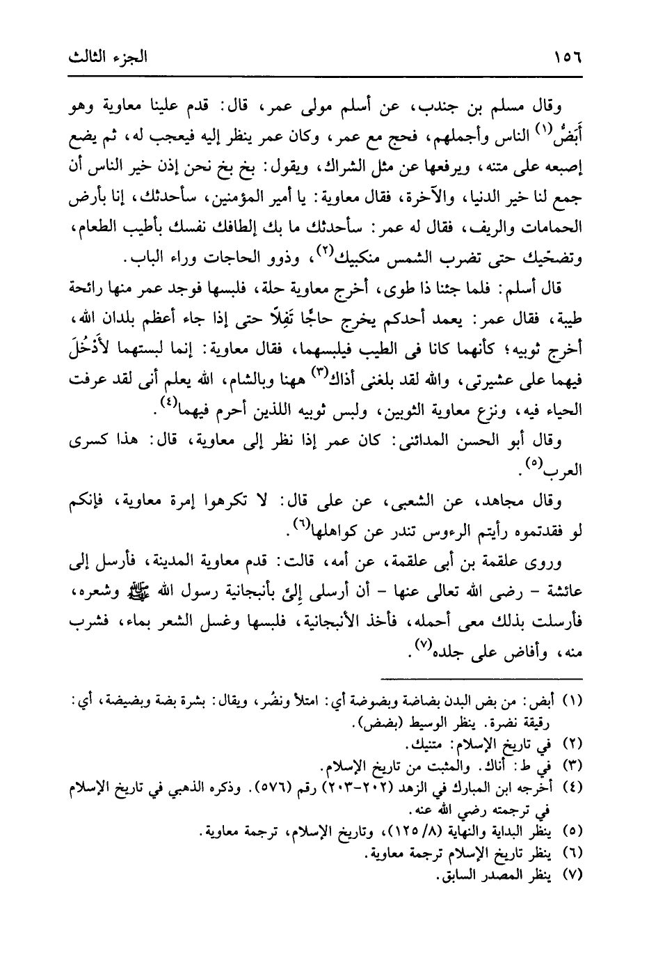 وَقَالَ مُسلم بن جُنْدُب عَن أسلم مولى عمر قَالَ قدم علينا مُعَاوِيَة وَهُوَ أَبَضُّ النَّاس وأجملهم فحج مَعَ عمر وَكَانَ عمر ينظر إِلَيْهِ فيعجب لَهُ ثمَّ يضع إصبعه على مَتنه ويرفعها عَن مثل الشرَاك وَيَقُول بخ بخ نَحن إِذن خير النَّاس أَن جمع لنا خير الدُّنْيَا وَالْآخِرَة فَقَالَ مُعَاوِيَة يَا أَمِير الْمُؤمنِينَ سأحدثك إِنَّا بِأَرْض الحمامات والريف فَقَالَ لَهُ عمر سأحدثك مَا بك إلطافك نَفسك بأطيب الطَّعَام وتضحيك حَتَّى تضرب الشَّمْس منكبيك وذوو الْحَاجَات وَرَاء الْبَاب قَالَ أسلم فَلَمَّا جِئْنَا ذَا طوى أخرج مُعَاوِيَة حلَّة فلبسها فَوجدَ عمر مِنْهَا رَائِحَة طيبَة فَقَالَ عمر يعمد أحدكُم يخرج حَاجا تَفِلا حَتَّى إِذا جَاءَ أعظم بلدان الله أخرج ثوبيه كَأَنَّهُمَا كَانَا فِي الطّيب فيلبسهما فَقَالَ مُعَاوِيَة إِنَّمَا لبستهما لأَدخُلَ فيهمَا على عشيرتي وَالله لقد بَلغنِي أذاك هَهُنَا وبالشام الله يعلم أَنِّي لقد عرفت الْحيَاء فِيهِ وَنزع مُعَاوِيَة الثَّوْبَيْنِ وَلبس ثوبيه اللَّذين أحرم فيهمَا وَقَالَ أَبُو الْحسن الْمَدَائِنِي كَانَ عمر إِذا نظر إِلَى مُعَاوِيَة قَالَ هَذَا كسْرَى الْعَرَب وَقَالَ مُجَاهِد عَن الشّعبِيّ عَن عَليّ قَالَ لَا تكْرهُوا إمرة مُعَاوِيَة فَإِنَّكُم لَو فقدتموه رَأَيْتُمْ الرُّءُوس تندر عَن كواهلها وروى عَلْقَمَة بن أبي عَلْقَمَة عَن أمه قَالَت قدم مُعَاوِيَة الْمَدِينَة فَأرْسل إِلَى عَائِشَة رَضِي الله تَعَالَى عَنْهَا أَن أرسلي إِلي بأنجانية رَسُول الله