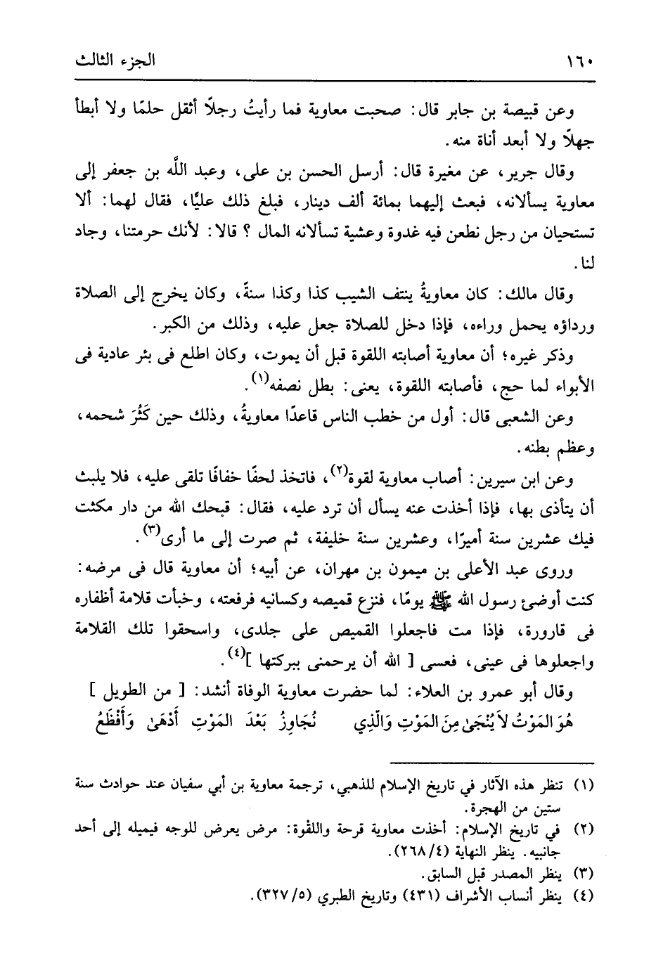 وَعَن قبيصَة بن جَابر قَالَ صَحِبت مُعَاوِيَة فَمَا رأيتُ رجلا أثقل حلماً وَلَا أَبْطَأَ جهلا وَلَا أبعد أَنَاة مِنْهُ وَقَالَ جرير عَن مُغيرَة قَالَ أرسل الْحسن بن عَليّ وَعبد الله بن جَعْفَر إِلَى مُعَاوِيَة يسألانه فَبعث إِلَيْهِمَا بِمِائَة ألف دِينَار فَبلغ ذَلِك عليا فَقَالَ لَهما أَلا تستحيان من رجل نطعن فِيهِ غدْوَة وَعَشِيَّة تسألانه المَال قَالَا لِأَنَّك حرمتنا وجاد لنا وَقَالَ مَالك كَانَ معاويةُ ينتف الشيب كَذَا وَكَذَا سنة وَكَانَ يخرج إِلَى الصَّلَاة وَرِدَاؤُهُ يحمل وَرَاءه فَإِذا دخل للصَّلَاة جعل عَلَيْهِ وَذَلِكَ من الْكبر وَذكر غَيره أَن مُعَاوِيَة أَصَابَته اللقوة قبل أَن يَمُوت وَكَانَ اطلع فِي بِئْر عَادِية فِي الْأَبْوَاء لما حج فأصابته اللقوة يَعْنِي بَطل نصفه وَعَن الشّعبِيّ قَالَ أول من خطب النَّاس قَاعِدا معاويةُ وَذَلِكَ حِين كَثُرَ شحمه وَعظم بَطْنه وَعَن ابْن سِيرِين أصَاب مُعَاوِيَة لقُوَّة فَاتخذ لحفاً خفافاً تلقى عَلَيْهِ فَلَا يلبث أَن يتَأَذَّى بهَا فَإِذا أخذت عَنهُ يسْأَل أَن ترد عَلَيْهِ فَقَالَ قبحك الله من دَار مكثت فِيك عشْرين سنة أميرَاً وَعشْرين سنة خَليفَة ثمَّ صرت إِلَى مَا أرى وروى عبد الْأَعْلَى بن مَيْمُون بن مهْرَان عَن أَبِيه أَن مُعَاوِيَة قَالَ فِي مَرضه كنت أوضئ رَسُول الله