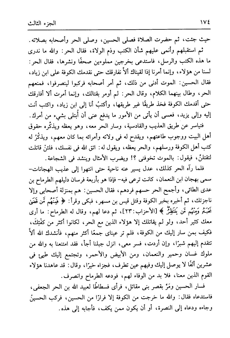 حَيْثُ جِئْت ثمَّ حضرت الصَّلَاة فصلى الْحُسَيْن وَصلى الْحر وَأَصْحَابه بِصَلَاتِهِ ثمَّ اسْتَقْبَلَهُمْ وأنمى عَلَيْهِم شَأْن الْكتب وذم الْوُلَاة فَقَالَ الْحر وَالله مَا نَدْرِي لسنا من هَؤُلَاءِ وَإِنَّمَا أمرنَا إِذا لقيناك ألاَ نُفَارِقك حَتَّى نقدمك الْكُوفَة على ابْن زِيَاد فَقَالَ الْحُسَيْن الْمَوْت أدنى من ذَلِك ثمَّ أَمر أَصْحَابه فَرَكبُوا لينصرفوا فَمَنعهُمْ الْحر وَطَالَ بَينهمَا الْكَلَام وَقَالَ الْحر لم أومر بقتالك وَإِنَّمَا أمرت أَلا أُفَارِقك حَتَّى أقدمك الْكُوفَة فَخذ طَرِيقا غير طريقها وأكتبُ أَنا إِلَى ابْن زِيَاد واكتب أَنْت إِلَيْهِ وَإِلَى يزِيد فَعَسَى أَن يَأْتِي من الْأُمُور مَا يدْفع عني أَن أُبتلى بِشَيْء من أَمرك فتياسر عَن طَرِيق العذيب والقادسية وَسَار الْحر مَعَه وَهُوَ يعظه ويذكره حُقُوق أهل الْبَيْت وَوُجُوب طاعتهم ويقدح لَهُ فِي ولاته وأمرائه بِمَا كَانَ مَعَهم ويذكُرُ لَهُ كتب أهل الْكُوفَة ورسلهم وَالْحر يعظه وَيَقُول لَهُ اتَّقِ الله فِي نَفسك فلئن قَاتَلت لتقتلن فَيَقُول بِالْمَوْتِ تخوفني وَيضْرب الْأَمْثَال وينشد فِي الشجَاعَة فَلَمَّا رَآهُ لحر كَذَلِك عدل يسير عَنهُ نَاحيَة حَتَّى انْتَهوا إِلَى عذيب الهجانات سمي بهجان ابْن النُّعْمَان كَانَت ترعى فِيهِ فَإِذا هُوَ بأَرْبعَة فرسَان دليلهم الطرماح بن عدي الطَّائِي وأجمح الْحر حسهم فردهم فَقَالَ الْحُسَيْن هم بِمَنْزِلَة أَصْحَابِي وَإِلَّا ناجزتك ثمَّ أخبرهُ بِخَبَر الْكُوفَة وَقتل قيس بن مسْهر فَبكى وَقَرَأَ {فَمِنهُم مَّن قَضَى نَحبَه وَمنهُم مَن يَنتَظِر} الْأَحْزَاب 23 ثمَّ دَعَا لَهُم وَقَالَ لَهُ الطرماح مَا أرى مَعَك كثير أحد وَلَو لم يقاتلك إِلَّا هَؤُلَاءِ الَّذين مَعَ الْحر لكانوا أَكثر من كفْئِكَ فَكيف بِمن سَار إِلَيْك من الْكُوفَة فَلم تَرَ عَيْنَايَ جمعا أَكثر مِنْهُم فأنشدك الله ألاَ تتقدم إِلَيْهِم شبْرًا وَإِن أردْت فسر معي انْزِلْ جبلنا أجأ فقد امتنعنا بِهِ وَالله من مُلُوك غَسَّان وحمير والنعمان وَمن الْأَبْيَض والأحمر وتجتمع إِلَيْك طَيئ فِي عشْرين ألفَاً لَا يُوصل إِلَيْك وَفِيهِمْ عين تطرف فجزاه خيرا وَقَالَ قد عاهدنا هَؤُلَاءِ الْقَوْم الَّذين مَعنا فَلَا بُد من الْوَفَاء لَهُم فودعه الطرماح وَانْصَرف فَسَار الْحُسَيْن ومَرَ بقصر بني مقَاتل فَرَأى فسطاطاً لِعبيد الله بن الْحر الْجعْفِيّ فاستدعاه فَقَالَ وَالله مَا خرجت من الْكُوفَة إِلَّا فرارَاً من الْحُسَيْن فَركب الحسينُ وجاءه وَدعَاهُ إِلَى النُّصْرَة أَو أَن يكون مِمَّن يكف فَأَجَابَهُ إِلَى هَذِه