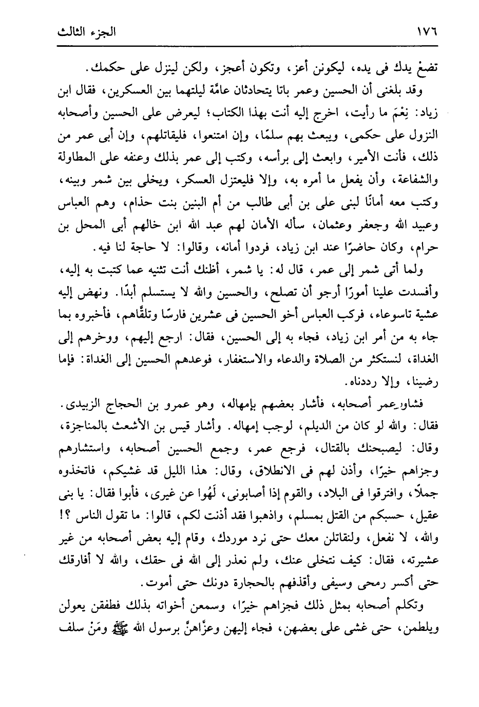 تضع يدك فِي يَده لَيَكُونن أعز وَتَكون أعجز وَلَكِن لينزل على حكمك وَقد بَلغنِي أَن الْحُسَيْن وَعمر باتا يتحادثان عَامَّة ليلتهما بَين العسكرين فَقَالَ ابْن زِيَاد نِعمَ مَا رَأَيْت اخْرُج إِلَيْهِ أَنْت بِهَذَا الْكتاب ليعرض على الْحُسَيْن وَأَصْحَابه النُّزُول على حكمي وَيبْعَث بهم سلما وَإِن امْتَنعُوا فليقاتلهم وَإِن أَبى عمر من ذَلِك فَأَنت الْأَمِير وَابعث إِلَيّ بِرَأْسِهِ وَكتب إِلَى عمر بذلك وعنفه على المطاولة والشفاعة وَأَن يفعل مَا أمره بِهِ وَإِلَّا فليعتزل الْعَسْكَر ويخلي بَين شمر وَبَينه وَكتب مَعَه أَمَانًا لبني عَليّ بن أبي طَالب من أم الْبَنِينَ بنت حذام وهم الْعَبَّاس وَعبيد الله وجعفر وَعُثْمَان سَأَلَهُ الْأمان لَهُم عبد الله ابْن خالهم أبي الْمحل بن حرَام وَكَانَ حَاضرا عِنْد ابْن زِيَاد فَردُّوا أَمَانه وقلوا لَا حَاجَة لنا فِيهِ وَلما أَتَى شمر إِلَى عمر قَالَ لَهُ يَا شمر أَظُنك أَنْت تثنيه عَمَّا كتبت بِهِ إِلَيْهِ وأفسدت علينا أموراً أَرْجُو أَن تصلح وَالْحُسَيْن وَالله لَا يستسلم أبدا ونهض إِلَيْهِ عَشِيَّة تاسوعاء فَركب الْعَبَّاس أَخُو الْحُسَيْن فِي عشْرين فَارِسًا وتلقاهم فأخبروه بِمَا جَاءَ بِهِ من أَمر ابْن زِيَاد فجَاء بِهِ إِلَى الْحُسَيْن فَقَالَ ارْجع إِلَيْهِم ووخرهم إِلَى الْغَدَاة لنستكثر من الصَّلَاة وَالدُّعَاء وَالِاسْتِغْفَار فَوَعَدَهُمْ الْحُسَيْن إِلَى الْغَدَاة فإمَّا رَضِينَا وَإِلَّا رددناه فَشَاور عمر أَصْحَابه فَأَشَارَ بَعضهم بإمهاله وَهُوَ عَمْرو بن الْحجَّاج الزبيدِيّ فَقَالَ وَالله لَو كَانَ من الديلم لوَجَبَ إمهاله وَأَشَارَ قيس بن الْأَشْعَث بالمناجزة وَقَالَ ليصبحنك بِالْقِتَالِ فَرجع عمر وَجمع الْحُسَيْن أَصْحَابه واستشارهم وجزاهم خيرَاً وَأذن لَهُم فِي الانطلاق وَقَالَ هَذَا اللَّيْل قد غشيكم فاتخذوه جملا وافترقوا فِي الْبِلَاد وَالْقَوْم إِذا أصابوني لَهُوا عَن غَيْرِي فَأَبَوا فَقَالَ يَا بني عقيل حسبكم من الْقَتْل بِمُسلم واذهبوا فقد أَذِنت لكم قَالُوا مَا تَقول النَّاس وَالله لَا نَفْعل ولنقاتلن مَعَك حَتَّى نرد موردك وَقَامَ إِلَيْهِ بعض أَصْحَابه من غير عشيرته فَقَالَ كَيفَ نتخلى عَنْك وَلم نغدر إِلَى الله فِي حَقك وَالله لَا أُفَارِقك حَتَّى أكسر رُمْحِي وسيفي وأقذفهم بِالْحِجَارَةِ دُونك حَتَّى أَمُوت وَتكلم أَصْحَابه بِمثل ذَلِك فجزاهم خيرَاً وسمعن أخواته بذلك فطفقن يعولن ويلطمن حَتَّى غشي على بَعضهنَّ فجَاء إلَيْهِنَّ وعزاهن برَسُول الله