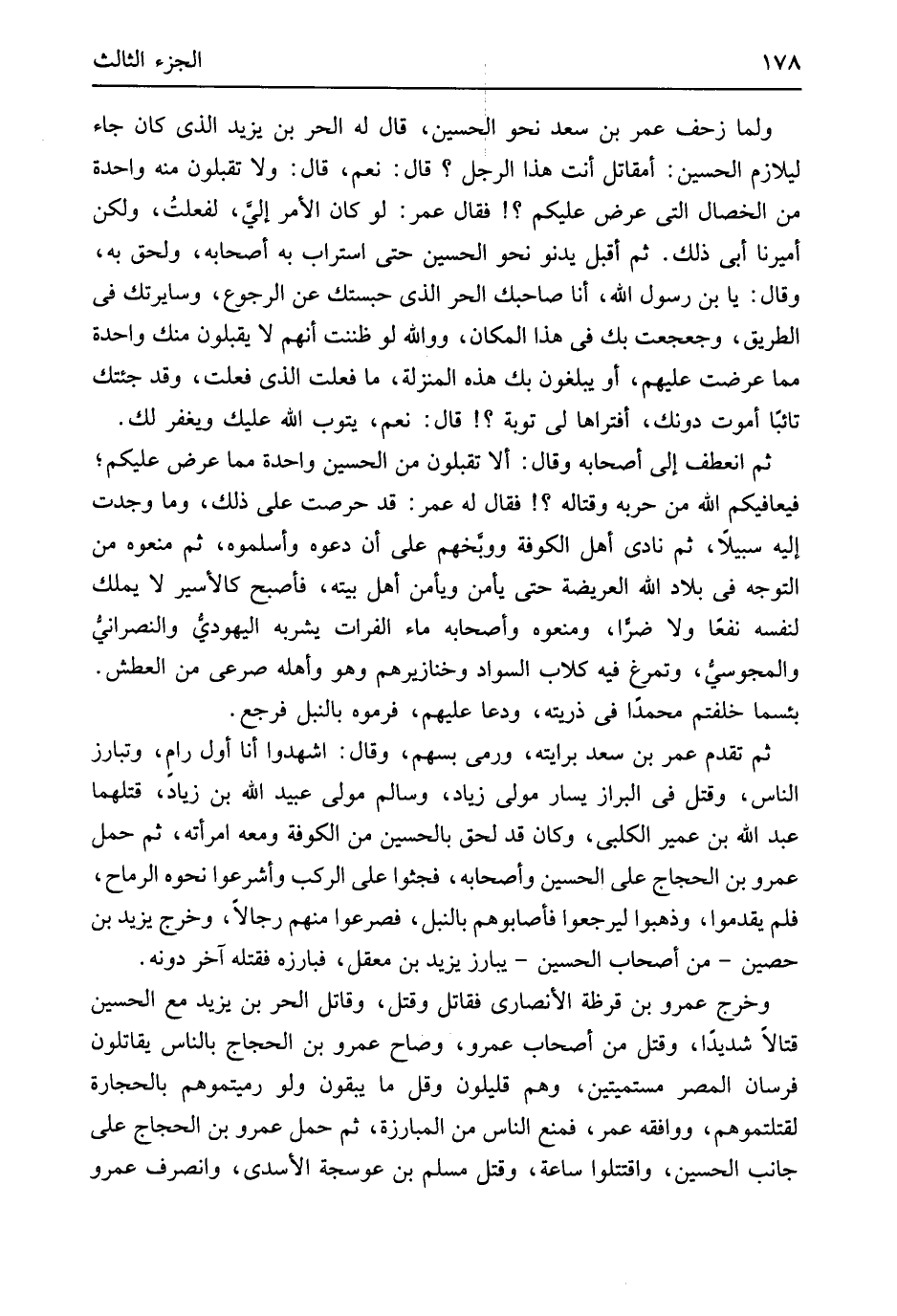 وَلما زحف عمر بن سعد نَحْو الْحُسَيْن قَالَ لَهُ الْحر بن يزِيد الَّذِي كَانَ جَاءَ ليلازم الْحُسَيْن أمقاتل أَنْت هَذَا الرجل قل نعم قَالَ وَلَا تقبلون مِنْهُ وَاحِدَة من الْخِصَال الَّتِي عرض عَلَيْكُم فَقَالَ عمر لَو كَانَ الْأَمر إِلَيّ لفعلتُ وَلَكِن أميرنا أَبى ذَلِك ثمَّ أقبل يدنو نَحْو الْحُسَيْن حَتَّى استراب بِهِ أَصْحَابه وَلحق بِهِ وَقَالَ يَا بن رَسُول الله أَنا صَاحبك الْحر الَّذِي حبستك عَن الرُّجُوع وسايرتك فِي الطَّرِيق وجعجعت بك فِي هَذَا الْمَكَان وَوَاللَّه لَو ظَنَنْت أَنهم لَا يقبلُونَ مِنْك وَاحِدَة مِمَّا عرضت عَلَيْهِم أَو يبلغون بك هَذِه الْمنزلَة مَا فعلت الَّذِي فعلت وَقد جئْتُك تائبَاً أَمُوت دُونك أفتراها لي تَوْبَة قَالَ نعم يَتُوب الله عَلَيْك وَيغْفر لَك ثمَّ انعطف إِلَى أَصْحَابه وَقَالَ أَلا تقبلون من الْحُسَيْن وَاحِدَة مِمَّا عرض عَلَيْكُم فيعافيكم الله من حربه وقتاله فَقَالَ لَهُ عمر قد حرصت على ذَلِك وَمَا وجدت إِلَيْهِ سبيلاَ ثمَّ نَادَى أهل الْكُوفَة ووبخهم على أَن دَعوه وأسلموه ثمَّ منعُوهُ من التَّوَجُّه فِي بِلَاد الله العريضة حَتَّى يَأْمَن ويأمن أهل بَيته فَأصْبح كالأسير لَا يملك لنَفسِهِ نفعا وَلَا ضراً ومنعوه وَأَصْحَابه مَاء الْفُرَات يشربه الْيَهُودِيّ والنصرانيُ والمجوسيُ وتمرغ فِيهِ كلاب السوَاد وخنازيرهم وَهُوَ وَأَهله صرعى من الْعَطش بئْسَمَا خَلفْتُمْ مُحَمَّدًا فِي ذُريَّته ودعا عَلَيْهِم فَرَمَوْهُ بِالنَّبلِ فَرجع ثمَّ تقدم عمر بن سعد برايته وَرمى بِسَهْم وَقَالَ اشْهَدُوا أَنا أول رامٍ وتبارز النَّاس وَقتل فِي البرَاز يسَار مولى زِيَاد وَسَالم مولى عبيد الله بن زِيَاد قَتلهمَا عبد الله بن عُمَيْر الْكَلْبِيّ وَكَانَ قد لحق بالحسين من الْكُوفَة وَمَعَهُ امْرَأَته ثمَّ حمل عَمْرو بن الْحجَّاج على الْحُسَيْن وَأَصْحَابه فجثوا على الركب وأشرعوا نَحوه الرماح فَلم يقدموا وذهبوا ليرجعوا فأصابوهم بِالنَّبلِ فصرعوا مِنْهُم رجَالًا وَخرج يزِيد بن حُصَيْن من أَصْحَاب الْحُسَيْن يبارز يزِيد بن معقل فبارزه فَقتله آخر دونه وَخرج عَمْرو بن قرظة الْأنْصَارِيّ فقاتل وَقتل وَقَاتل الْحر بن يزِيد مَعَ الْحُسَيْن قتالاَ شَدِيدا وَقتل من أَصْحَاب عَمْرو وَصَاح عَمْرو بن الْحجَّاج بِالنَّاسِ يُقَاتلُون فرسَان الْمصر مستميتين وهم قَلِيلُونَ وَقل مَا يبقون وَلَو رميتموهم بِالْحِجَارَةِ لقتلتموهم وَوَافَقَهُ عمر فَمنع النَّاس من المبارزة ثمَّ حمل عَمْرو بن الْحجَّاج على جَانب الْحُسَيْن واقتتلوا سَاعَة وَقتل مُسلم بن عوسج الْأَسدي وَانْصَرف عَمْرو