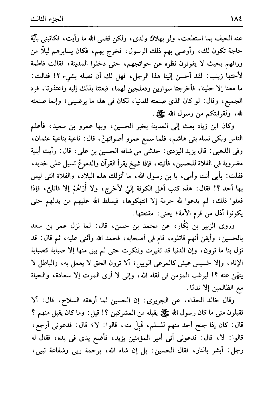 عَنهُ الحيف بِمَا اسْتَطَعْت وَلَو بِهَلَاك وَلَدي وَلَكِن قضى الله مَا رَأَيْت فكاتبني بأية حَاجَة تكون لَك وَأوصى بهم ذَلِك الرَّسُول فَخرج بهم فَكَانَ يسايرهم لَيْلًا من ورائهم بِحَيْثُ لَا يفوتون نظره عَن حوائجهم حَتَّى دخلُوا الْمَدِينَة فَقَالَت فَاطِمَة لأختها زَيْنَب لقد أحسن إِلَيْنَا هَذَا الرجل فَهَل لَك أَن نصله بِشَيْء فَقَالَت مَا مَعنا إِلَّا حلينا فأخرجتا سِوَارَيْنِ ودملجين لَهما فبعثتا بذلك إِلَيْهِ واعتذرتا فَرد الْجَمِيع وَقَالَ لَو كَانَ الَّذِي صَنعته للدنيا لَكَانَ فِي هَذَا مَا يرضيني وَإِنَّمَا صَنعته لله ولقرابتكم من رَسُول الله