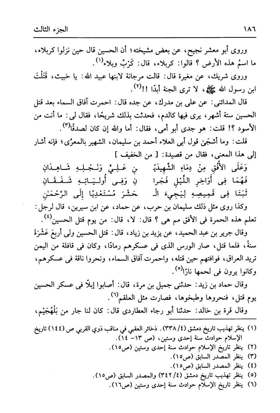 وَكَذَا روى مثل ذَلِك سُلَيْمَان بن حَرْب عَن حَمَّاد عَن ابْن سِيرِين قَالَ لرجل تعلم هَذِه الْحمرَة فِي الْأُفق مِم هِيَ قَالَ لَا قَالَ من يَوْم قتل الْحُسَيْن وَقَالَ جرير بن عبد الحميد عَن يزِيد بن زِيَاد قَالَ قتل الْحُسَيْن ولي أَربع عَشرَةَ سنة فَلَمَّا قتل صَار الورس الَّذِي فِي عَسْكَرهمْ رَمَادا وَكَانَ فِي قافلة من الْيمن تُرِيدُ الْعرَاق فوافتهم حِين قَتله واحمرت آفَاق السَّمَاء ونحروا نَاقَة فِي عَسْكَرهمْ وَكَانُوا يرَوْنَ فِي لَحمهَا نَارا وَقَالَ حَمَّاد بن زيد حَدثنِي جميل بن مرّة قَالَ أَصَابُوا إبِلا فِي عَسْكَر الْحُسَيْن يَوْم قتل فنحروها وطبخوها فَصَارَت مثل العلقم وَقَالَ قُرَّة بن خَالِد حَدثنَا أَبُو رَجَاء العطاردي قَالَ كَانَ لنا جَار من بلهُجَيْم
