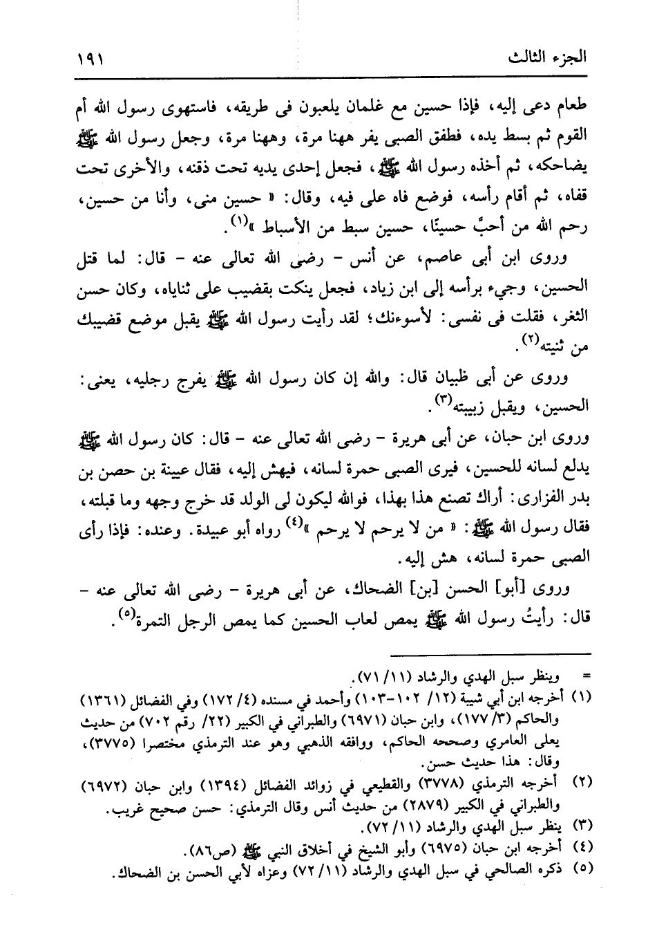 يفرج رجلَيْهِ يَعْنِي الْحُسَيْن وَيقبل زبيبته وروى ابْن حبَان عَن أبي هُرَيْرَة رَضِي الله تَعَالَى عَنهُ قَالَ كَانَ رَسُول الله