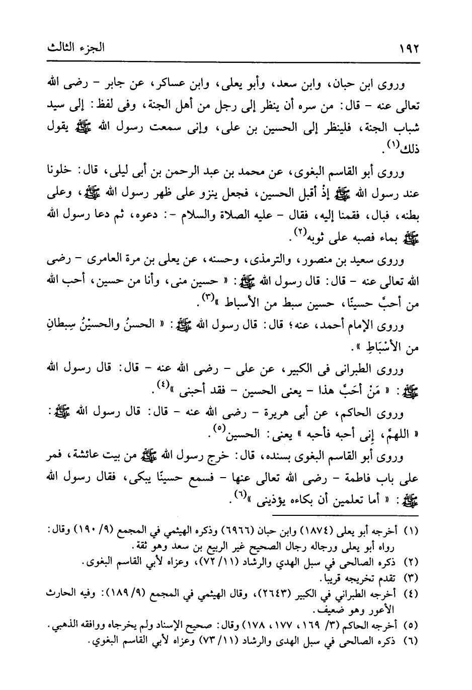 وروى ابْن حبَان وَابْن سعد وَأَبُو يعلى وَابْن عَسَاكِر عَن جَابر رَضِي الله تَعَالَى عَنهُ قَالَ من سره أَن ينظر إِلَى رجل من أهل الْجنَّة وَفِي لفظ إِلَى سيد شباب الْجنَّة فَلْينْظر إِلَى الْحُسَيْن بن عَليّ وَإِنِّي سَمِعت رَسُول الله