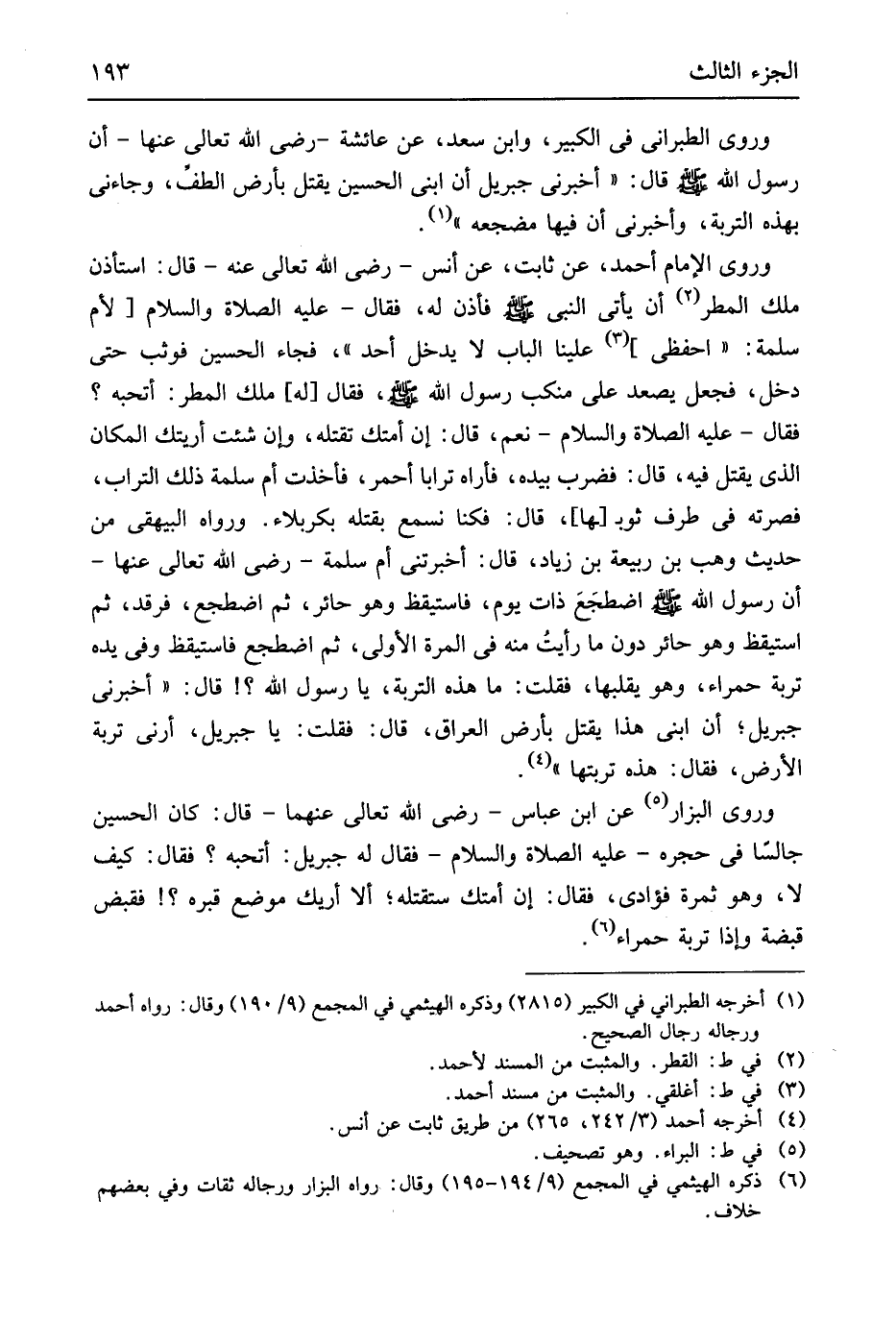 اضطجَعَ ذَات يَوْم فَاسْتَيْقَظَ وَهُوَ حائر ثمَّ اضْطجع فرقد ثمَّ اسْتَيْقَظَ وَهُوَ حائر دون مَا رأيتُ مِنْهُ فِي الْمرة الأولى ثمَّ اضْطجع وَفِي يَده تربة حَمْرَاء وَهُوَ يقلبها فَقلت مَا هَذِه التربة يَا رَسُول الله قَالَ أَخْبرنِي جِبْرِيل أَن ابْني هَذَا يقتل بِأَرْض الْعرَاق قَالَ فَقلت يَا جِبْرِيل أَرِنِي تربة الأَرْض فَقَالَ هَذِه تربَتهَا وروى الْبَزَّار عَن ابْن عَبَّاس رَضِي الله تَعَالَى عَنْهُمَا قَالَ كَانَ الْحُسَيْن جَالِسا فِي حجره عَلَيْهِ الصَّلَاة وَالسَّلَام فَقَالَ لَهُ جِبْرِيل أَتُحِبُّهُ فَقَالَ كَيفَ لَا وَهُوَ ثَمَرَة فُؤَادِي فَقَالَ إِن أمتك ستقتله أَلا أريك مَوضِع قَبره فَقبض قَبْضَة وَإِذا تربة حَمْرَاء