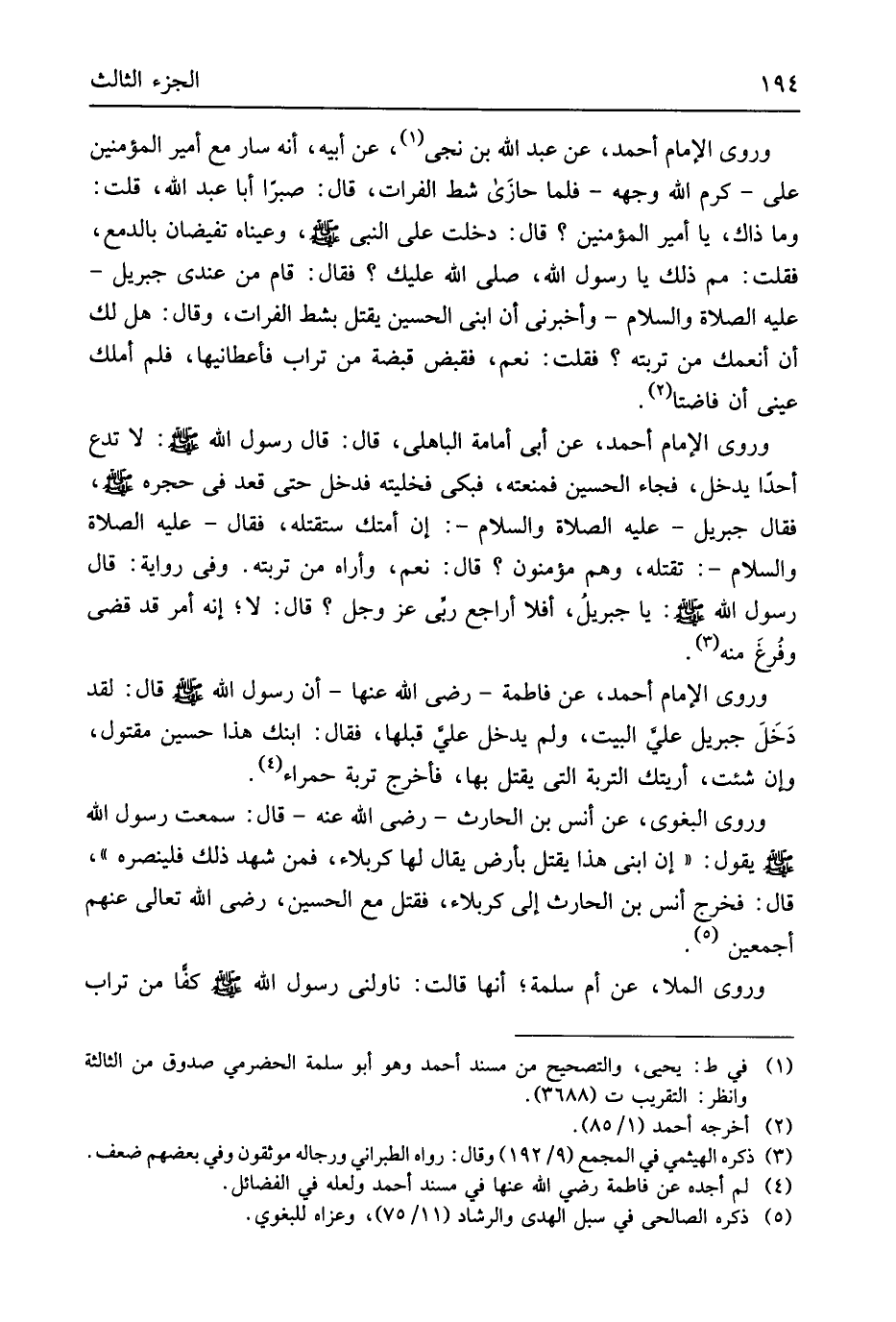 وَعَيناهُ تفيضان بالدمع فَقلت مِم ذَلِك يَا رَسُول الله صلى الله عَلَيْك فَقَالَ قَامَ من عِنْدِي جِبْرِيل عَلَيْهِ الصَّلَاة السَّلَام وَأَخْبرنِي أَن ابْني الْحُسَيْن يقتل بشط الْفُرَات وَقَالَ هَل لَك أَن أنعمك من تربته فَقلت نعم فَقبض من تُرَاب فَأَعْطَانِيهَا فَلم أملك عَيْني أَن فاضتا وروى الإِمَام أَحْمد عَن أبي أُمَامَة الْبَاهِلِيّ قَالَ قَالَ رَسُول الله