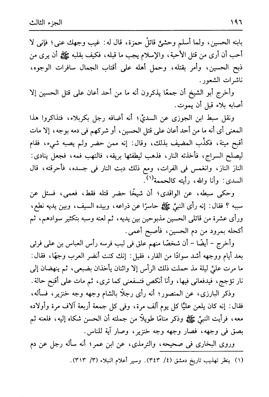 حاسراً عَن ذراعه وَبِيَدِهِ السَّيْف وَبَين يَدَيْهِ نطع وَرَأى عشرَة من قاتلي الْحُسَيْن مذبوحين بَين يَدَيْهِ ثمَّ لَعنه وسبه بتكثير سوادهم ثمَّ أكحله بمرود من دم الْحُسَيْن فَأصْبح أعمى وَأخرج أيضَاً أَن شخصا مِنْهُم علق فِي لبب فرسه رَأس الْعَبَّاس بن عَليّ فَرُئِيَ بعد أَيَّام وَوَجهه أَشد سوادَاً من القار فَقيل إِنَّك كنت أَنْضَرُ الْعَرَب وَجها فَقَالَ مَا مرت عَليّ لَيْلَة مذ حملت ذَلِك الرَّأْس إِلَّا وَاثْنَانِ يأخذان بضبعي ثمَّ ينهضان إِلَى نَار تؤجج فيدفعاني فِيهَا وَأَنا أنكص فتسفعني كَمَا ترى ثمَّ مَاتَ على أقبح حَالَة وَذكر الْبَارِزِيّ عَن الْمَنْصُور أَنه رأى رجلا بِالشَّام وَجهه وَجه خِنْزِير فَسَأَلَهُ فَقَالَ إِنَّه كَانَ يلعن عليا كل يَوْم ألف مرّة وَفِي كل جُمُعَة ربعَة آلَاف مرّة وَأَوْلَاده مَعَه فَرَأَيْت النَّبِي