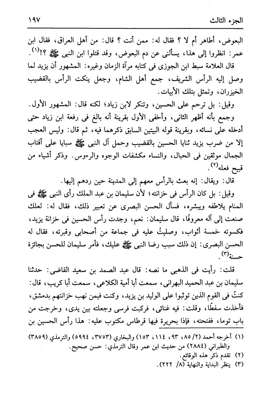 عَلَيْك فَأمر سُلَيْمَان لِلْحسنِ بجائزة حَسَنَة قلت رَأَيْت فِي الذَّهَبِيّ مَا نَصه قَالَ عبد الصَّمد بن سعيد القَاضِي حَدثنَا سُلَيْمَان بن عبد الحميد البهراني سَمِعت أَبَا أُميَّة الكلَاعِي سَمِعت أَبَا كريب قَالَ كنتُ فِي الْقَوْم الَّذين توثبوا على الْوَلِيد بن يزِيد وَكنت فِيمَن نهب خزانتهم بِدِمَشْق فَأخذت سفطاً وَقلت فِيهِ غنائي فركبت فرسي وَجَعَلته بَين يَدي وَخرجت من بَاب توما ففتحته فَإِذا بحريرة قيها قرطاس مَكْتُوب عَلَيْهِ هَذَا رَأس الْحُسَيْن بن
