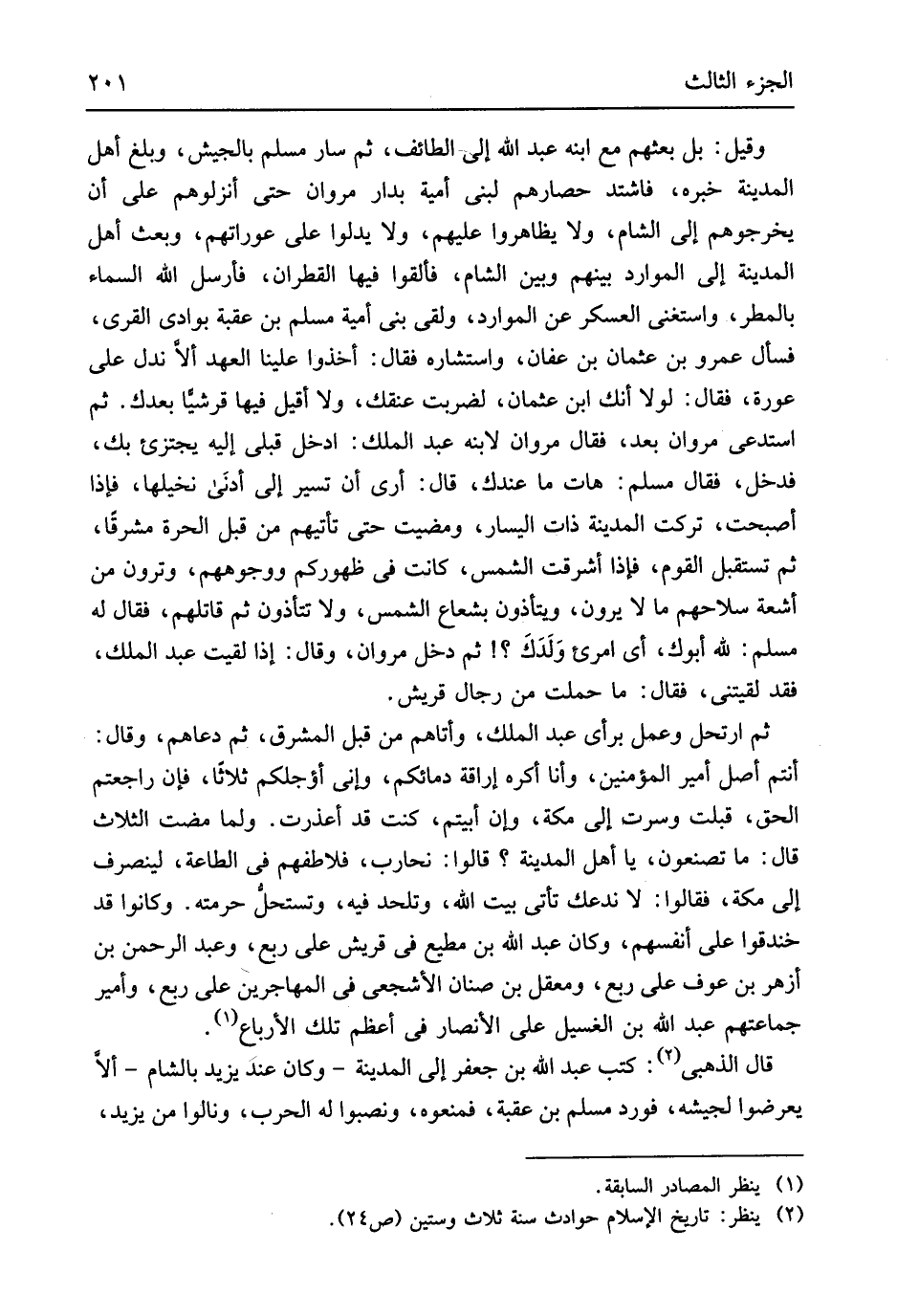 وَقيل بل بَعثهمْ من ابْنه عبد الله إِلَى الطَّائِف ثمَّ سَار مُسلم بالجيش وَبلغ أهل الْمَدِينَة خَبره فَاشْتَدَّ حصارهم لبني أُميَّة بدار مَرْوَان حَتَّى أنزلوهم على أَن يخرجوهم إِلَى الشَّام وَلَا يظاهروا عَلَيْهِم وَلَا يدلوا على عواراتهم وَبعث أهل الْمَدِينَة إِلَى الْمَوَارِد بَينهم وَبَين الشَّام فَألْقوا فِيهَا القطران فَأرْسل الله السَّمَاء بالمطر وَاسْتغْنى الْعَسْكَر عَن الْمَوَارِد وَلَقي بني أُميَّة مُسلم بن عقبَة بوادي الْقرى فَسَأَلَ عَمْرو بن عُثْمَان بن عَفَّان واستشاره فَقَالَ أخذُوا علينا الْعَهْد أَلا ندل على عَورَة فَقَالَ لَوْلَا أَنَّك ابْن عُثْمَان لضَرَبْت عُنُقك وَلَا أقيل فِيهَا قرشياً بعْدك ثمَّ استدعى مَرْوَان بعد فَقَالَ مَرْوَان لِابْنِهِ عبد الْملك ادخل قبلي إِلَيْهِ يجتزئ بك فَدخل فَقَالَ مُسلم هَات مَا عنْدك قَالَ أرى أَن تسير إِلَى أدنَى نخيلها فَإِذا أَصبَحت تركت الْمَدِينَة ذَات الْيَسَار ومضيت حَتَّى تأتيهم من قبل الْحرَّة مشرقاً ثمَّ تسْتَقْبل الْقَوْم فَإِذا أشرقت الشَّمْس كَانَت فِي ظهوركم ووجوههم وترون من أشعة سِلَاحهمْ مَا لَا يرَوْنَ ويتأذون بشعاع الشَّمْس وَلَا تتأذون ثمَّ قَاتلهم فَقَالَ لَهُ مُسلم لله أَبوك أَي امْرِئ وَلَدَكَ ثمَّ دخل مَرْوَان وَقَالَ إِذا لقِيت عبد الْملك فقد لقيتني قَالَ مَا حملت من رجال قُرَيْش ثمَّ ارتحل وَعمل بِرَأْي عبد الْملك وأتاهم من قبل الْمشرق ثمَّ دعاهم وَقَالَ أَنْتُم أصل أَمِير الْمُؤمنِينَ وَأَنا أكره إِرَاقَة دمائكم وَإِنِّي أؤجلكم ثَلَاثًا فَإِن راجعتم الْحق قبلت وسرت إِلَى مَكَّة وَإِن أَبَيْتُم كنت قد أعذرت وَلما مَضَت الثَّلَاث قَالَ مَا تَصْنَعُونَ يَا أهل الْمَدِينَة قَالُوا نحارب فلاطفهم فِي الطَّاعَة لينصرف إِلَى مَكَّة فَقَالُوا لَا نَدعك تَأتي بَيت الله وتلحد فِيهِ وتستحل حرمته وَكَانُوا قد خندقوا على أنفسهم وَكَانَ عبد الله بن مُطِيع فِي قُرَيْش على ربع وَعبد الرَّحْمَن بن أَزْهَر بن عَوْف على ربع وَمَعْقِل بن صنان الْأَشْجَعِيّ فِي الْمُهَاجِرين على ربع وأمير جَمَاعَتهمْ عبد الله بن الغسيل على الْأَنْصَار فِي أعظم تِلْكَ الأرباع قَالَ الذَّهَبِيّ كتب عبد الله بن جَعْفَر إِلَى الْمَدِينَة وَكَانَ عِنْد يزِيد بِالشَّام أَلا يعرضُوا لجيشه فورد مُسلم بن عقبَة فمنعوه ونصبوا لَهُ الْحَرْب ونالوا من يزِيد