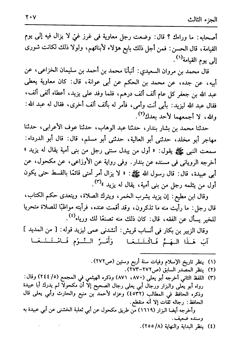 أَصْحَابه مَا وَرَاءَك قَالَ وضعت رجل مُعَاوِيَة فِي غرز غي لَا يزَال فِيهِ يَوْم الْقِيَامَة قَالَ الْحسن فَمن أجل ذَلِك بَايع هَؤُلَاءِ لأبنائهم وَلَوْلَا ذَلِك لكَانَتْ شُورَى إِلَى يَوْم الْقِيَامَة قَالَ مُحَمَّد بن مَرْوَان السعيدي أَنبأَنَا مُحَمَّد بن أَحْمد بن سُلَيْمَان الْخُزَاعِيّ عَن أَبِيه عَن جده عَن مُحَمَّد بن الحكم عَن أبي عوَانَة قَالَ كَانَ مُعَاوِيَة يُعْطي عبد الله بن جَعْفَر كل عَام ألف ألف دِينَار فَلَمَّا وَفد على يزِيد أعطَاهُ ألفي ألف فَقَالَ عبد الله ليزِيد بِأبي أَنْت وَأمي فَأمر لَهُ بِأَلف ألف أُخْرَى فَقَالَ لَهُ عبد الله وَالله لَا أجمعهما لأحد بعْدك حَدثنَا مُحَمَّد بن بشار بنْدَار حَدثنَا عبد الْوَهَّاب حَدثنَا عَوْف الْأَعرَابِي حَدثنَا مهَاجر أَبُو مخلد حَدثنِي أَبُو الْعَالِيَة حَدثنِي أَبُو مُسلم قَالَ قَالَ أَبُو الدَّرْدَاء سَمِعت النَّبِي